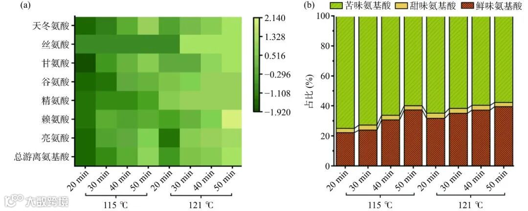 游离氨基酸按照呈味特性主要分为鲜味、甜味和苦味氨基酸。如图7(a)所示,热压条件的加剧使SCG游离氨基酸总量从0.35±0.04 mg/g上升至0.85±0.06 mg/g。结合图7(b)可以进一步得出,不同的热压条件对于游离氨基酸的释放起到了不同作用,总体表现为热压温度越高或时间越长,鲜味氨基酸(天冬氨酸和谷氨酸)占比从22.02%增加至39.43%,苦味氨基酸(亮氨酸)占比从74.60%下降至57.79%,甜味氨基酸(赖氨酸和精氨酸)占比则不具有明显变化(2.84%~3.20%)。此外,鲜味氨基酸占比升高主要与天冬氨酸含量变化有关,天冬氨酸的含量随着热压时间增加或温度升高而显著增加(P<0.05),在121 ℃、50 min时最高(0.89±0.09 mg/g)。这是因为天冬氨酸侧链含有羧基,在热压下可能更容易作为断裂点被释放并检测到含量上升。鲜味氨基酸占比升高或能掩盖SCG的整体苦味,使其更易被消费者接受。