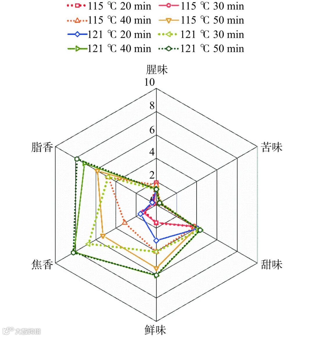 不同SCG的感官属性如图6所示。感官评定结果表明,热压提取的SCG不具有明显的腥味和苦味,并且不同制备条件的在甜味上相对接近。SCG在更剧烈的制备条件下具有更高强度的焦香、脂香和鲜味,并在121 ℃、50 min时强度评分均最高,分别为8.21±0.87、7.87±0.76和4.34±0.36分。