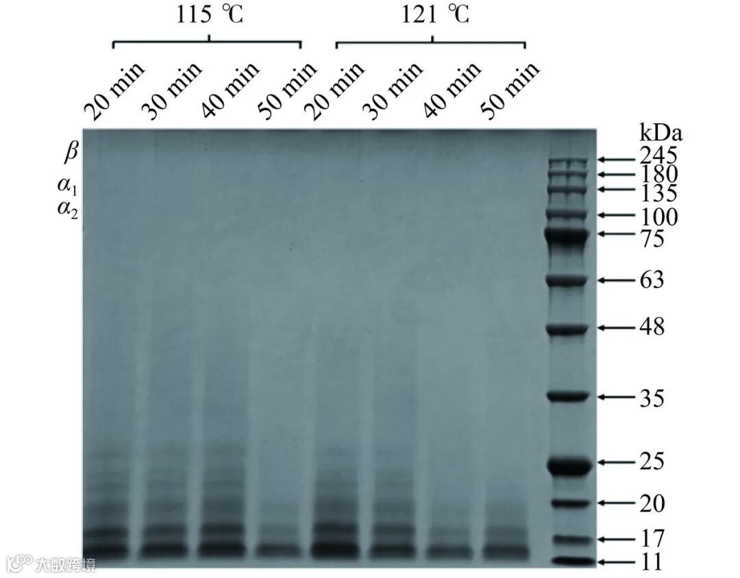 从图4中SDS-PAGE的结果可以看出SCG已不具有完整的大分子亚基结构,而以多组分的混合物形式呈现,热压破坏了稳定胶原结构的氢键和其他次级键,使三股螺旋结构趋于松散并向无规则线团转变。相较115 ℃,121 ℃条件下多肽链肽键更容易发生断裂,使分子量进一步降低,且在40 min的结果中尤为明显。此外,随着处理时间的延长,SCG的降解程度加剧,形成了更多的小分子片段。这一变化在电泳图谱上直观地表现为SCG条带的显著淡化,原因在于更为剧烈的热压条件促使SCG降解为更多分子量低于检测下限(约为11 kDa)的肽段和氨基酸,因此无法在凝胶上得到有效显现。