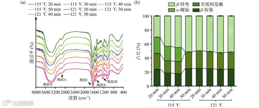 采用FTIR分析经过不同热压条件下处理的SCG的蛋白质二级结构差异结果如图2(a)所示。酰胺A带主要由N-H或O-H的伸缩振动引起的;酰胺I带主要与多肽主链的C=O伸缩振动有关;酰胺II带主要由C-H或N-H振动引起;酰胺III则与胶原蛋白三螺旋结构的完整性相关。八组热压提取的SCG的FTIR谱图较相似。在相同处理时间下,121 ℃相比115 ℃及在相同的温度下增加处理时间,酰胺I带吸收峰位置趋向短波长移动,同时酰胺B带信号强度减弱,反应胶原结构破坏程度加剧,形成了多肽和氨基酸。但八组样品在酰胺I带的吸收峰面积并没有显著差异(P>0.05),这可能是部分亚基仍无法充分释放所致。