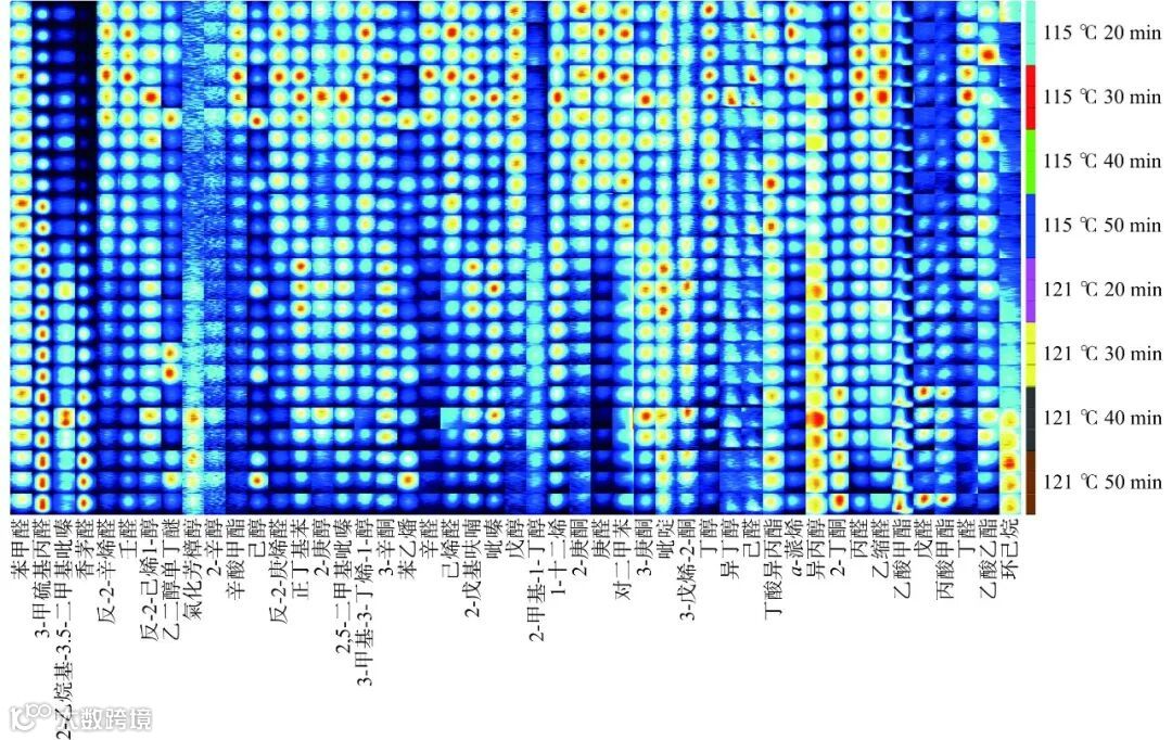以N-酮C4~C9作为外标物对挥发性物质进行定性,结果如表1所示,共鉴定出47种化合物,包括醛类14种,醇类11种,酮类5种,酯类5种,烯烃类3种,吡嗪类3种,芳香烃类2种,醚类1种,烷烃类1种,呋喃类1种以及吡啶类1种。并绘制了风味指纹图谱如图8所示,信号颜色越红所代表的物质含量越高。