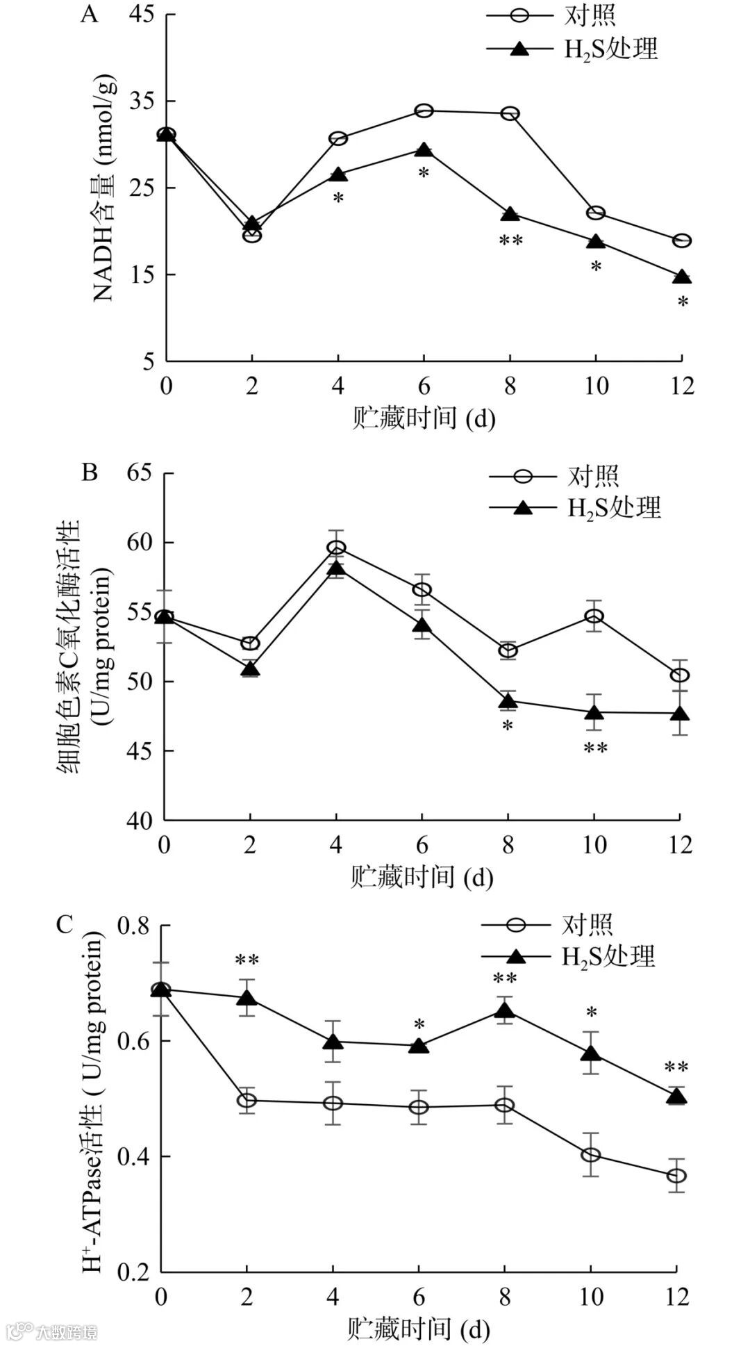 Figure 4. Effects of H2S treatment on NADH content (A) and the activities of CCO (B) and H+-ATPase (C) of harvested wax apple fruit