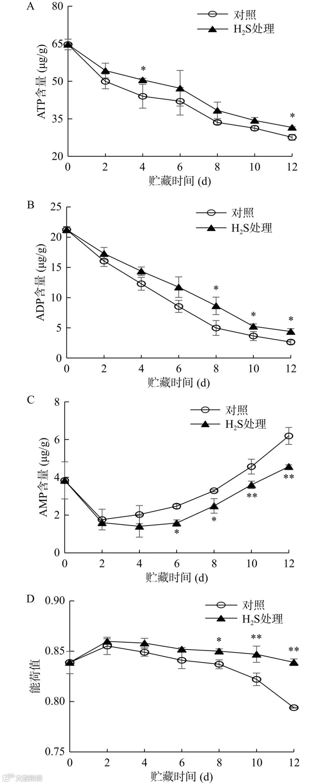 Figure 2. Effects of H2S treatment on the contents of ATP (A), ADP (B) and AMP (C), and energy charge (D) of harvested wax apple fruit