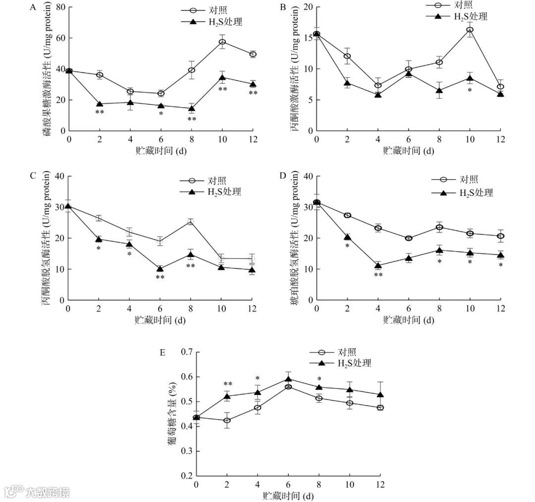 图 3 H2S对采后莲雾果实PFK(A)、PK(B)、PDH(C)和SDH(D)活性以及葡萄糖含量(E)的影响