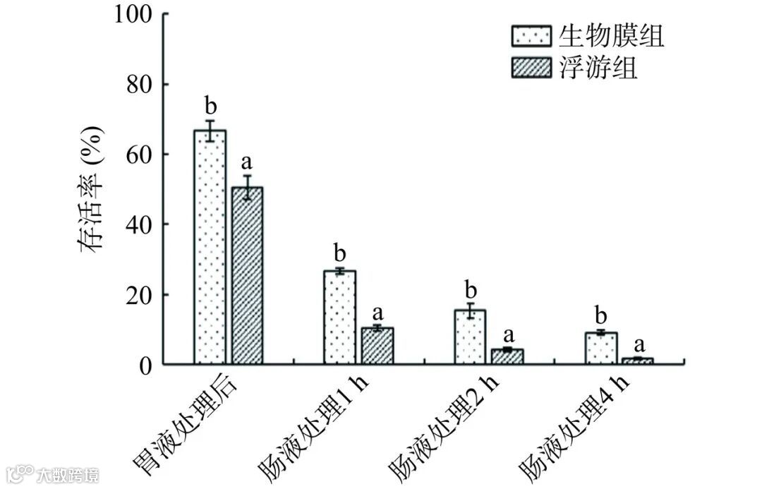 图 4 生物膜态和浮游态 BL-BOA-7 的胃肠液耐受能力