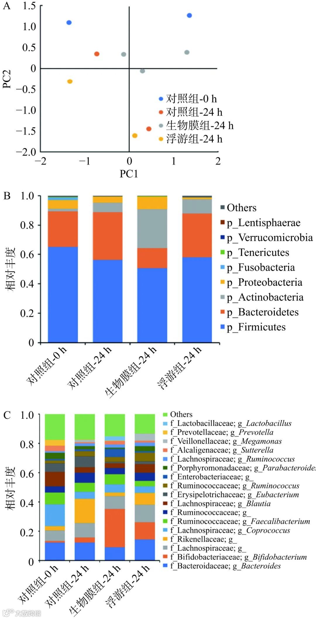 正常情况下,宿主的肠道菌群的组成相对稳定,益生菌相对于这个稳定的微生态系统而言,属于外来菌株,因此进入宿主肠道后可能与土著微生物之间存在一定的竞争关系,从而影响其生长和定植。本研究通过体外发酵实验,分析了生物膜态长双歧杆菌对肠道菌群的影响,及其在特定肠道菌群背景下的增殖情况。主成分分析结果表明,经体外发酵后,菌群组成发生了明显的变化,其中生物膜组存在更显著的聚类(图 6A)。相对于发酵前的样品(对照组-0h),在门水平上,对照组、生物膜组和浮游组在发酵 24 h 后放线菌门(Actinobacteria)的相对丰度均有所增加,其中生物膜组达到 26.69%;而生物膜组的拟杆菌门(Bacteroidetes)的丰度(13.25%)明显低于其他组样本(图 6B),这可能是由于物种间的竞争导致。在属水平上,生物膜组和浮游组的双歧杆菌属(Bifidobacterium)的丰度明显增加,这与 BL-BOA-7 的加入有关,其中生物膜组的双歧杆菌丰度达到 25.96%,是浮游组(11.86%)的 2 倍以上(图 6C),说明在接种量一致的情况下,生物膜态长双歧杆菌在正常肠道菌群的背景环境下,具有更强的竞争性和增殖能力,因此有助于菌株在肠道中的定植。