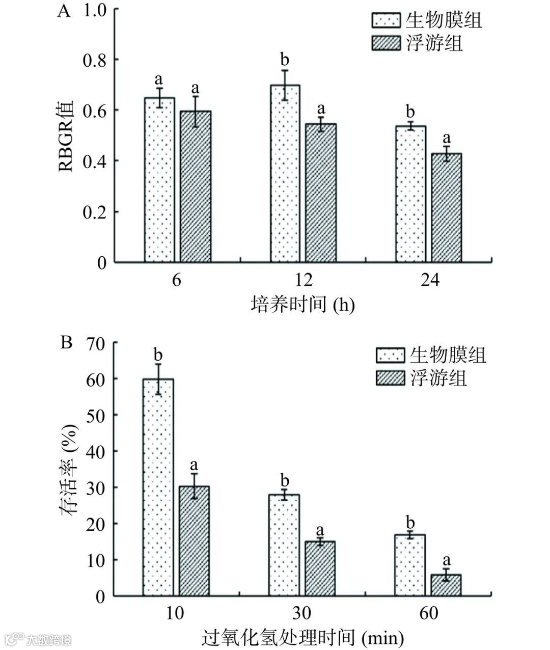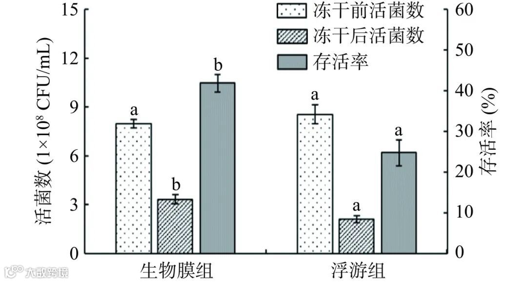 本研究以芒果皮膳食纤维为基质,制备生物膜态长双歧杆菌,发酵结束时,发酵体系中生物膜态菌体细胞的活菌数为 1.5×10^9 CFU/mL,占总活菌数的 40.6%。通过低速离心的方式将生物膜态菌体细胞进行分离,得到生物膜态长双歧杆菌,同时以浮游态长双歧杆菌作为对照,分别进行抗逆性试验,结果如图 3 所示。结果表明,冷冻干燥后,生物膜态和浮游态菌体的存活率分别为 41.82% 和24.78%(P<0.05),说明形成生物膜可以降低冻干过程对菌体细胞的损伤。E 等研究发现通过调节培养基中缓冲盐的组成,可以促进植物乳杆菌形成生物膜,并提高菌株的冻干存活率;而添加生物膜抑制剂,可以下调信号分子的表达、减少植物乳杆菌生物膜的形成,并降低菌株的冻干存活率。有研究表明,AI-2是促进生物膜形成的重要信号分子,冻干过程可以刺激乳酸菌 AI-2 的分泌,说明形成生物膜可能是乳酸菌抵抗冷冻胁迫的一种自我保活机制。