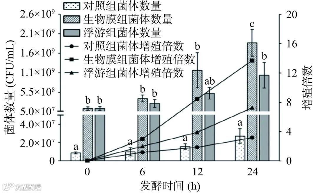 为进一步在中水平上分析本研究中的长双歧杆菌在体外发酵体系中的增殖情况,我们利用长双歧杆菌种特异性引物和定量 PCR,测定了体外发酵过程中长双歧杆菌的数量变化,结果如图 7 所示。在发酵 0 h 时,由于 BL-BOA-7 的接入,生物膜组和浮游组的长双歧杆菌数量明显高于对照组(P<0.05)。随着发酵过程的发展,各组长双歧杆菌的数量均有所增加;其中生物膜组的增殖速率最高,发酵 24 h 时,生物膜组长双歧杆菌的数量增长了 13.64 倍,而浮游组增长了 7.23 倍。实验结果表明,生物膜组长双歧杆菌在肠道环境中的具有更强的增殖能力。双歧杆菌通过形成生物膜可以为其内部的菌体提供更加适宜的生长条件,例如提高菌株的抗逆性和营养。在形成生物膜的过程中菌体分泌的胞外多糖可以从周围环境中吸收营养物质,促进菌株的增殖,从而提高菌株在肠道环境中的竞争能力。