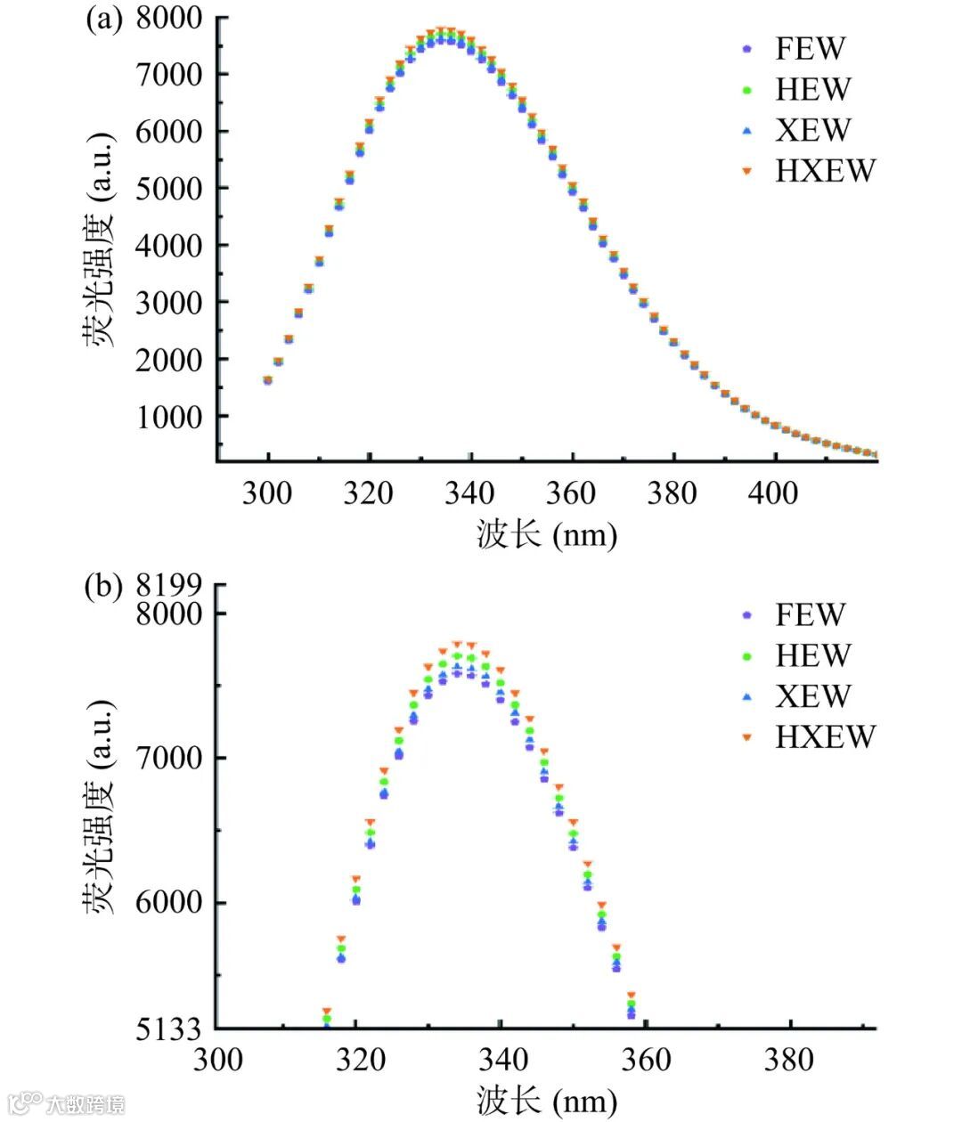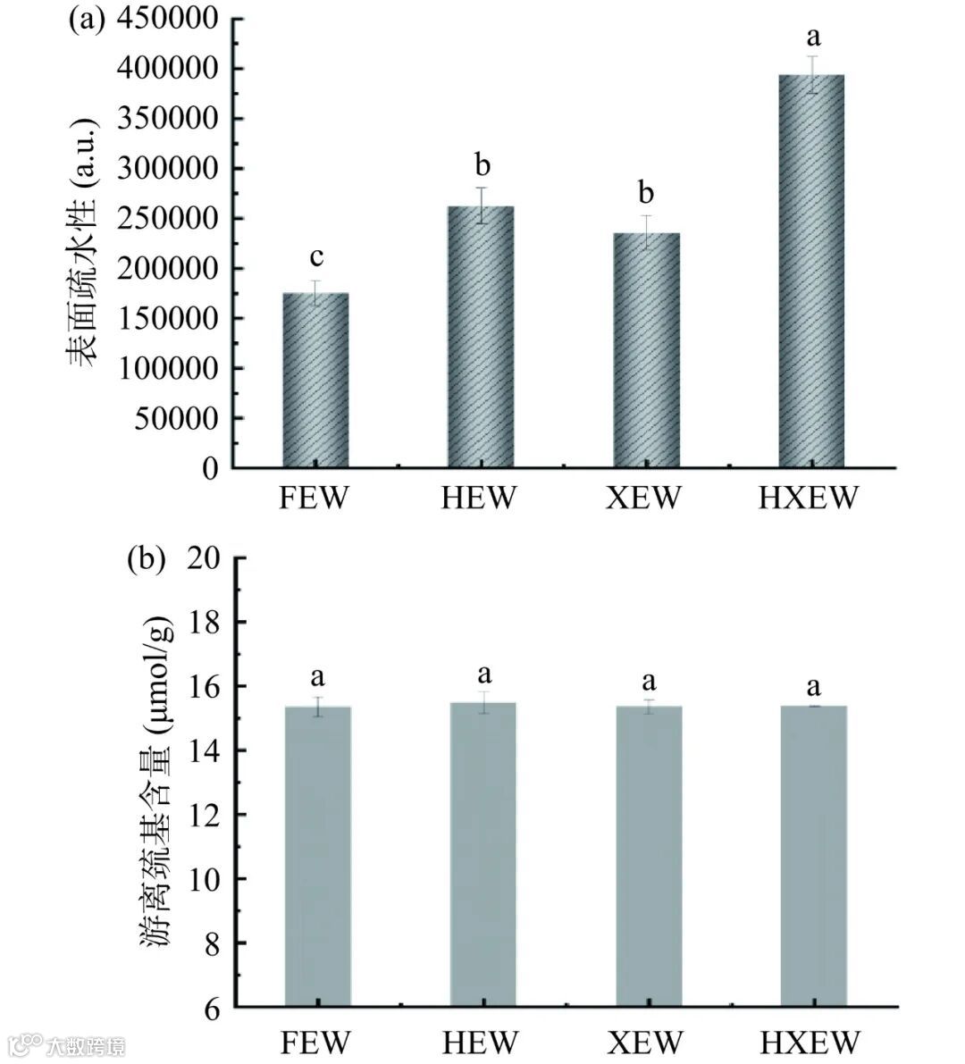 蛋白质分子的亲疏水特性直接决定了其在油-水界面上的性质,即蛋白质的乳化性能,且两者之间存在着密切的联系。由图 7(a)可以明显看出,HEW、XEW、和 HXEW 均比 FEW 的具有更高的表面疏水性 。实 验 结 果 表 明 , FEW 的 表 面 疏 水 指 数 为175044, HXEW 表 面 疏 水 指 数 为 393694.33, 比FEW 的高出 124.91%,其次是 HEW 和 XEW,表面疏水指数分别是 262431.67 和 235795.67。