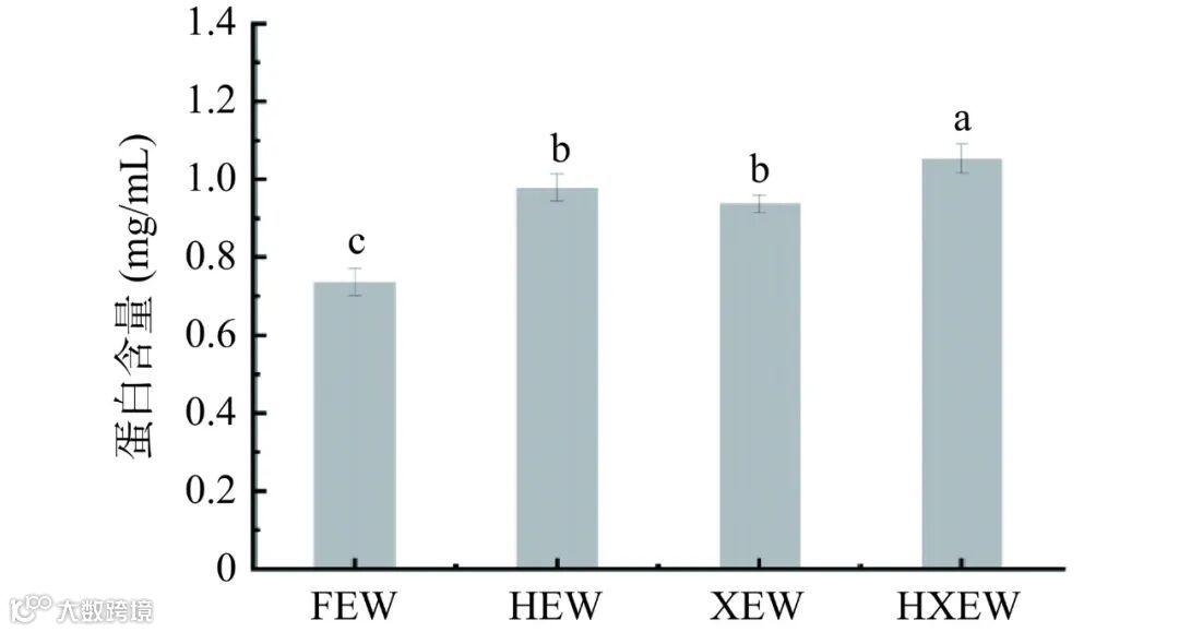 如图 3 所示,与未处理蛋清相比,经过高压均质和低聚木糖单一和复合处理后,蛋清溶解性均有所提高,其中 HXEW 溶解性提高最显著,可溶性蛋白浓度可达 1.05 mg/mL;与 FEW 的可溶性蛋白浓度为0.74 mg/mL 相比提高了 41.89%,HEW 和 XEW 的可溶性蛋白浓度分别提高了 32.84%、27.27%。结果表明高压均质增加蛋白质周围水的密度,使蛋白质与水分子之间的氢键网络结构发生改变,同时蛋白受到高速冲击、剪切力等综合作用部分断裂或展开,更大面积被水分子覆盖,且亲水性氨基酸残基从内部向外开放,电荷升高,增加了蛋白质与水结合的机会,使得溶解度提高。蛋清蛋白经低聚木糖处理后溶解性与未处理蛋清相比有所提高,其可能是低聚木糖糖链上含有丰富的亲水性官能团(-O-H)被引入蛋白质溶液中,分子更加容易与进入的水分子发生水合作用,增加了蛋白质与水结合的机会,且亲水性基团的暴露提高了蛋白溶解度。