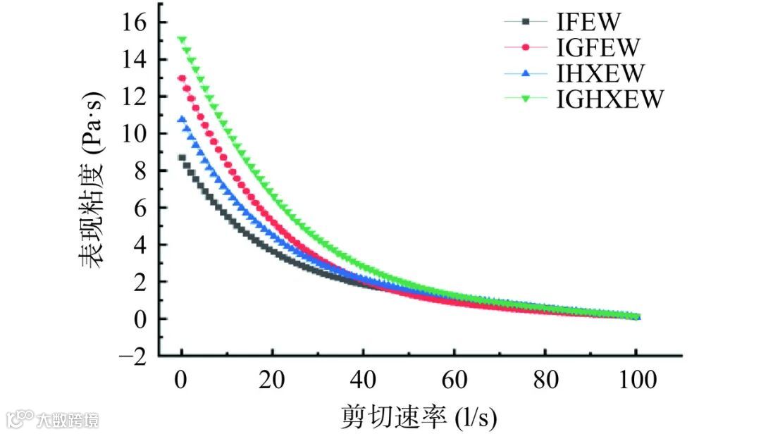 IGHXEW 比 IGFEW 的膨胀率提高了 36.70%、融化率降低了 14.29%,瓜尔豆胶分子能够将冰激凌内的水分固定在一起,阻碍了水分的扩散,更由于其具有尺寸适中、聚合数目大的脂肪聚集体,故体现更低的融化率,从而提高了冰激凌的融化性。而膨胀性的提高进一步说明了 HXEW 具备良好起泡性和泡沫稳定性。由于高压均质协同低聚木糖蛋清液具有良好的乳化性,冰淇淋中的奶油脂肪颗粒可以更好地吸附在气泡上,而高起泡性在搅打过程中产生均匀绵密,大小适中的气泡。由图 15 可看出,复合改性蛋清液制作的低脂冰淇淋有较好膨胀率和更低的融化率的作用机理,体系更加稳定。