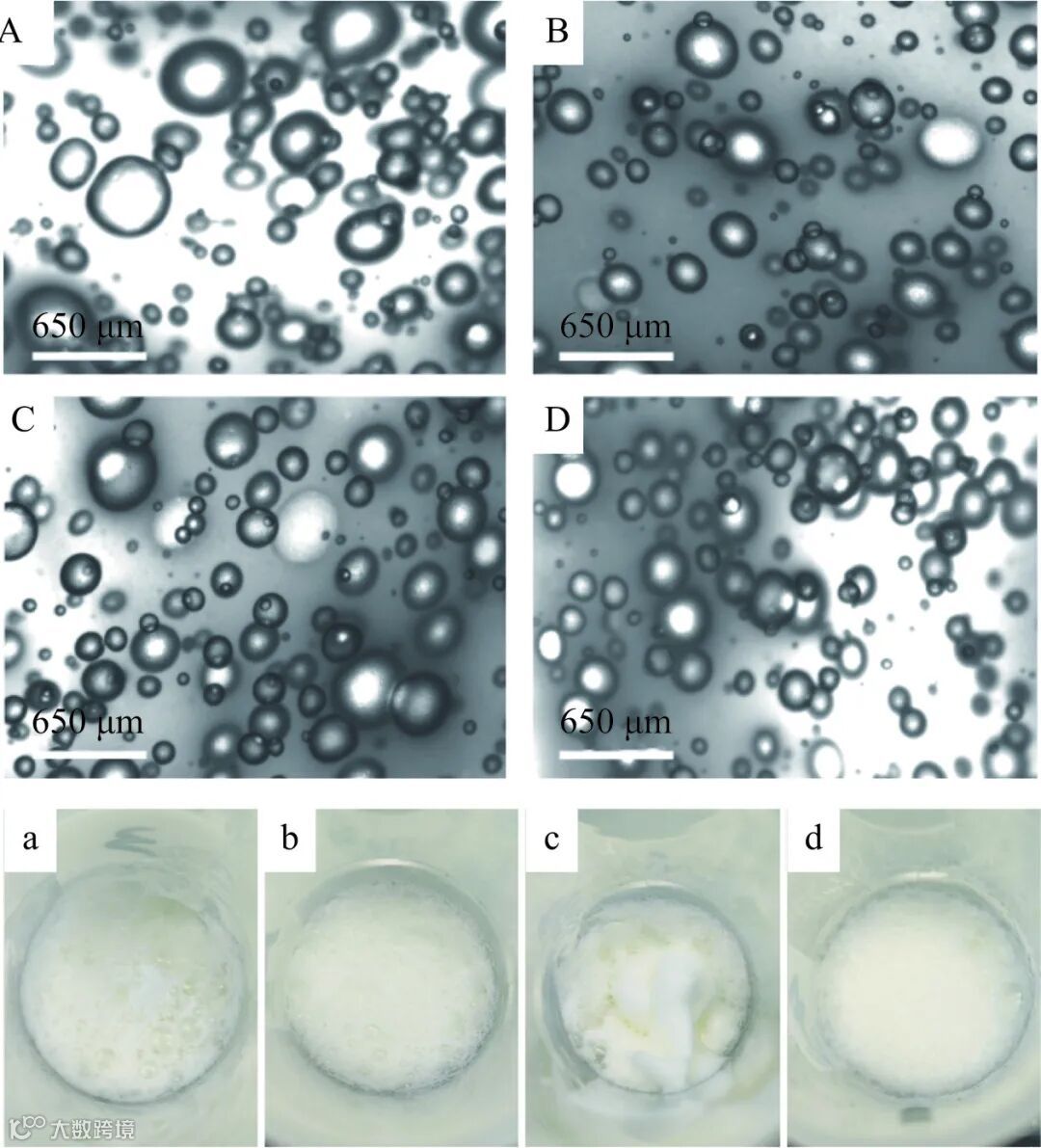 将蛋清均质 1 min 后微观与宏观图像记录在图 10 中。对于所有样品,FEW 泡沫松散,气泡尺寸大,泡沫体积大小不等,且分布不均;HEW 泡沫孔隙减小,并且出现大面积空隙,说明适当的高压作用能够提高蛋清起泡能力,使蛋清蛋白质分子分散程度增加,疏水基团暴露;XEW 泡沫绵密程度明显增加,说明低聚木糖有助于泡沫稳定性的改善,增加蛋清粘度,蛋清黏度越大,蛋清蛋白质分子间结构越稳定。这与表观粘度结果相符。HXEW 泡沫分布具有较高的密度和较好的均匀性,泡沫稳定性提高,表明产生了较小的蛋白质聚集体,表明高压均质协同低聚木糖处理能提高蛋清起泡性能,与起泡性结果一致。表面疏水性的增加对提高泡沫稳定性有一定作用。然而,高压均质结合低聚木糖对蛋清发泡性能增强的分子机制需要进一步研究。