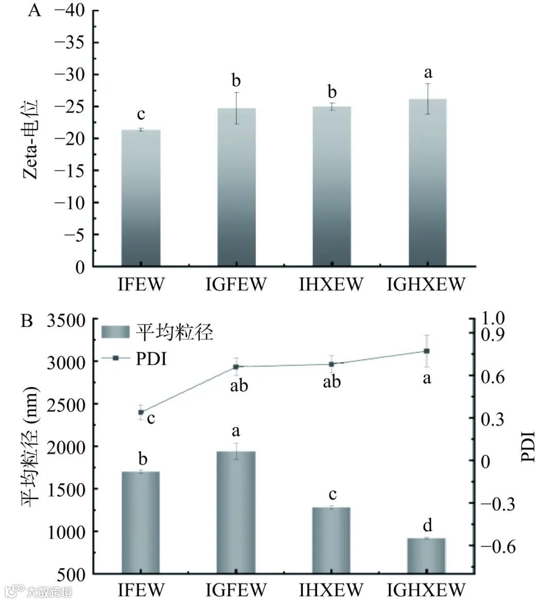通过测定冰淇淋浆液体系的粒径和 Zeta 电位,可以预测冰淇淋浆液的稳定性。如图 13A 所示可以观察到,与 IFEW 相比, IGFEW、IHXEW 和IGHXEW 样品的 Zeta 电位值绝对值明显提高。这很可能是由于瓜尔豆胶和 HXEW 的添加引入新电荷,使蛋白质内部的静电斥力增大,原有的蛋白质聚集结构被打破,增加了带电粒子的电位。粒径是在食品加工中应用模拟类似脂肪的光滑口感的重要特性,蛋白质颗粒的润滑能力可归因于其小粒径。PDI越小,说明冰淇淋浆料颗粒物质分布越均匀。如图 13B所示,IFEW 平均粒径为 1701.03 nm,PDI 为0.339。IGFEW、IHXEW 和 IGHXEW 平均粒径分别为 1938.33、1280.6 和 917.83 nm,其中 IGFEW 的平均粒径最大,IGHXEW 的平均粒径最小。说明单一添加瓜尔豆胶时,冰淇淋浆液颗粒形成较大的蛋白质聚集体,粒径增大。而 HXEW 具有比 FEW 更高的表面疏水性,油-水界面处吸附的蛋白质膜的机械性能和蛋白质分子之间的空间排斥力阻止了脂肪球在水相中聚结,因此粒径更小。