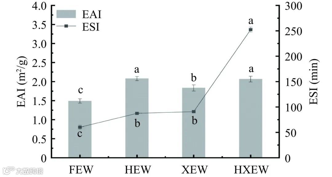 粒径是描述溶液体系小颗粒物质的平均大小的关键参数,PDI(Polydispersity index)反映粒度的分布情况,PDI 越小,小颗粒物质分布越均匀。如图 6(b)所示,FEW 平均粒径为 3750.75 nm,PDI 为0.932。HEW、 XEW 和 HXEW 平 均 粒 径 分 别 为246.08、2486.67 和 194.6 nm,其中 HXEW 的平均粒径最小,同时 PDI 最低为 0.36。随着粒径的减小,PDI 变小,表明较大的蛋白质聚集体已经形成更细小的颗粒。而 HEW 和 HXEW 的 PDI 明显变小,表明高压均质处理后使大颗粒聚集体破碎,从而减小了粒径,说明具有更好的分散稳定性。Negar 等也发现了相似的现象,即高压均质使牛奶分子的粒径分布更加均匀。颗粒更小。低聚木糖的添加使蛋白质内部的静电斥力增大,原有的蛋白质聚集结构被打破,形成更为细小颗粒。正如 Zeta 电位结果所示,高压均质协同低聚木糖复合处理使净电荷增加,蛋白质颗粒之间的能量壁垒相对较高,不易形成聚集体,平均粒径更小。