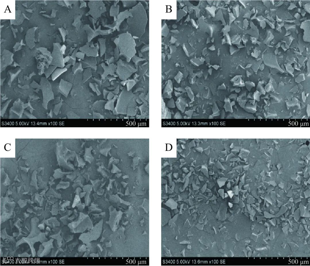 通过扫描电子显微镜观察不同处理蛋清蛋白微观结构的差异。如图 11 所示,FEW 颗粒较大,部分颗粒彼此粘连,凝结在一起,总体呈不规则且不均匀分布。HEW 颗粒减小,且分布更加松散,说明高压均质处理使蛋清颗粒的微观结构变得更细、紧密,改变颗粒聚集状态;XEW 颗粒略有减小,表明低聚木糖与蛋清蛋白发生了反应,促进了分子之间的作用,缩小了蛋白质之间的间隙,使蛋清颗粒结构更加稳定。HXEW 尺寸减小,分布更加均匀,形成均匀细小颗粒,蛋清蛋白质分子由结构紧密变为展开状态并暴露,扫描电镜图像表明复合处理对蛋清结构的影响程度要大于单一处理,使蛋清更加分散、均匀。