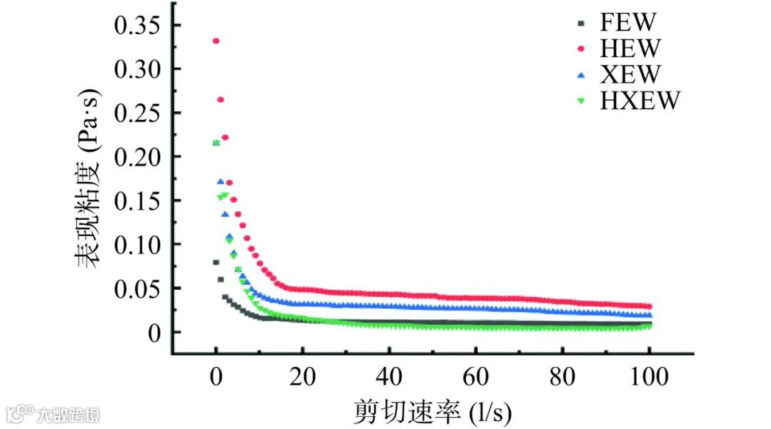 如图 4 所示,G'表示储能模量,有助于了解蛋白质之间的交联,反映了弹性特性;G''表示损耗模量,有助于了解液体流动行为,反映了粘性特性。蛋清液的 G'和 G''趋势近似相同,且 G'与 G''的数值与扫描频率呈正相关的关系,所有处理组蛋清的 G'> G'',说明弹性特性占主导地位,而不是粘性特性,因此,所有样品都可以描述为弱凝胶状结构或软凝胶网络。蛋清中蛋白质分子间相互作用力的增强会提高粘性。如图 4 所示,其中 HEW 和 HXEW 的储能模量和损耗模量均增加,说明高压均质处理和高压均质协同低聚木糖处理使蛋清中蛋白质的多肽链展开,疏水作用增强,促使蛋清体系的稳定性得到改善,单独进行低聚木糖处理使储能模量和损耗模量略有降低,其原因可能是蛋白质之间的相互作用减弱,导致其黏弹性降低,有利于蛋白质分子吸附到界面处和泡沫的形成。