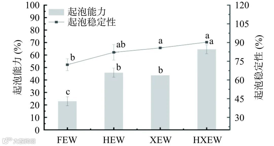 蛋白质的起泡性能与其在气-液两相界面上形成膜的性质相关。如图 2 所示,与 FEW 相比,HEW、XEW 和 HXEW 的起泡能力均有所提高,分别提高了 99.96%、80.88% 和 182.85%;泡沫稳定性提高了13.63%、18.68% 和 25.03%。与未处理蛋清相比,高压均质处理可显著提高蛋清起泡能力,其原因是使蛋白质聚集体打散,其结构展开。适当的高压均质使蛋白质表面疏水基团暴露,蛋白质能够更快地被气液界面所吸附,降低表面张力,起泡性增大。韩莛璐在研究高压均质对酪蛋白起泡性的影响时得出酪蛋白 60 MPa 和 80 MPa 处理时其起泡性有些降低,而随着压力升高其起泡性和泡沫稳定性又有一定程度的提升。