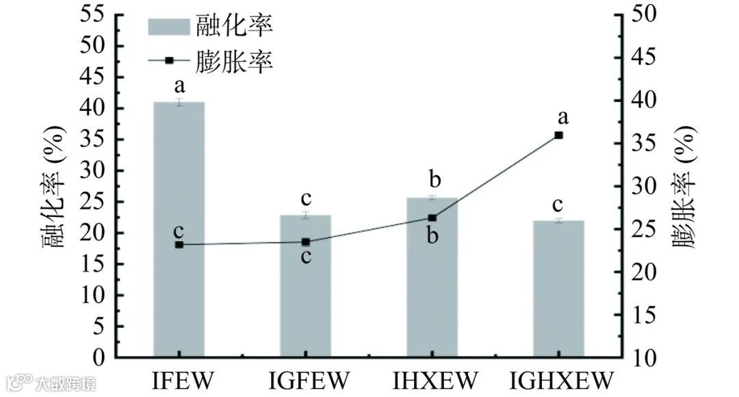 融化率和膨胀率是影响冰淇淋品质的重要属性。低融化率和高膨胀率是被期望的。由图 14可知,与 IFEW 相比,IHXEW 制作冰淇淋具有更为良好的膨胀性和融化性,冰淇淋的膨胀率从 23.17%增大到 26.30%,而融化率降低了 36.49%,其原因在于 HXEW 具有良好的乳化性能和起泡性能。好的乳化性和起泡性可以增强蛋白质维持水油界面的能力。