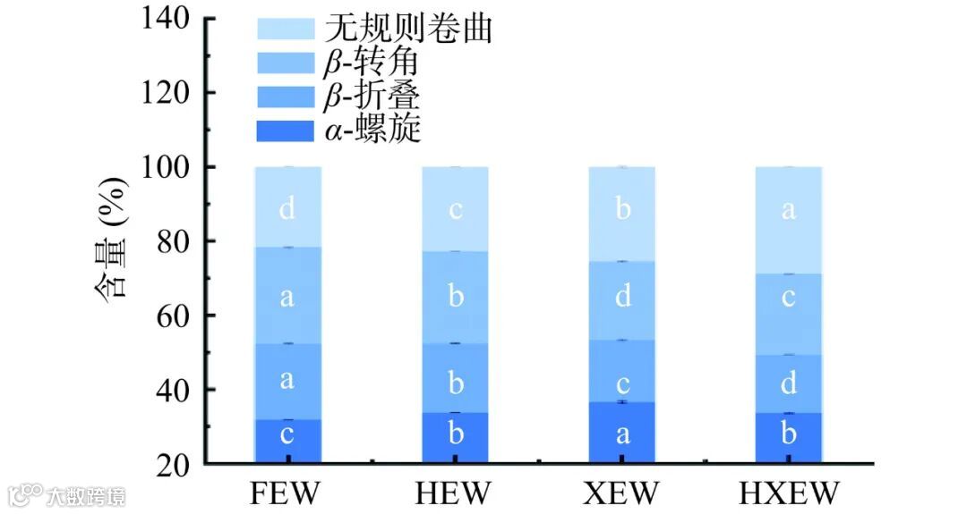 如图 8 所示,蛋清中蛋白质的 α-螺旋、β-折叠、β-转角以及无规则卷曲都发生了显著变化。与FEW 相比 HEW、XEW 和 HXEW 的 α-螺旋相对含量,分别提高了 6.12% 和 15.00%、5.90%;β-折叠相对含量大体呈下降趋势,分别下降了 9.14%、18.39%、23.49%;此外,与 FEW 相比,HEW、XEW、HXEW,β-转角相对含量分别降低了 4.80%、18.87%、16.54%;HEW、XEW 和 HXEW 中无规则卷曲相对含量与FEW相比分别提高了 5.23%、17.90% 和 33.24%。这表明蛋白质的稳定有序构象被破坏,分子结构变得柔韧松散。高压均质可以破坏蛋白质的有序结构,在机械剪切力的作用下具有随机爆裂、解聚或解离的作用,从而减小粒径,同时高压均质打开蛋白质分子使其疏水基团暴露并相互作用从而增加其表面疏水性。