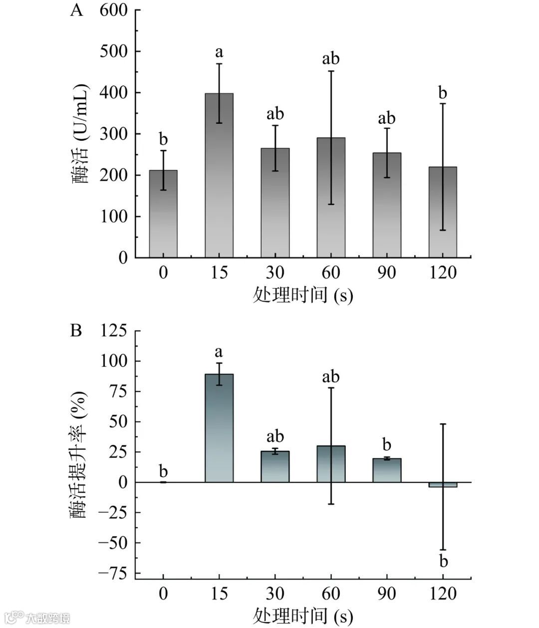 图 2 CP处理前后纤维素酶的酶活(A)及酶活提升率(B)的变化
