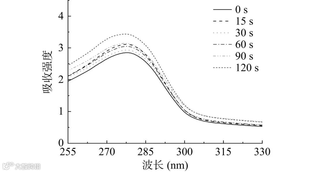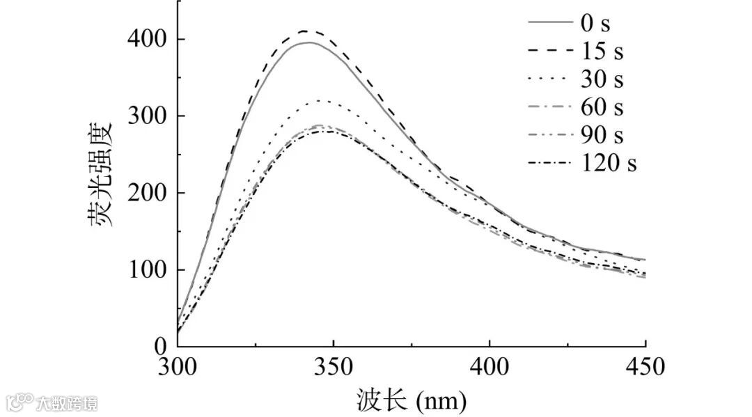 如图4所示,纤维素酶在280 nm处有较大的紫外吸收,其主要是由蛋白质肽链上的Trp、Tyr以及Phe等残基的芳香杂环发生π→π*跃迁所引起的。未经处理的纤维素酶在270~285 nm范围内的最大紫外吸收值为2.848,经CP处理15 s后,纤维素酶的最大吸收值增加为3.112,这可能表明CP处理使酶的构象发生改变,其内部芳香残基中疏水芳香环朝着酶表面移动,从而使吸光度增加,这种变化可能更有利于酶与底物的接触。当处理时间为30 s和60 s时,纤维素酶的紫外吸收值较15 s时出现了下降,产生这种现象的原因可能是长时间的CP处理引发了酶蛋白之间的聚集,导致紫外吸收强度发生下降,这一结果会阻碍酶活性位点和底物之间的接触,从而影响酶的催化效率。随着处理时间增加到90 s和120 s时,纤维素酶的吸收强度出现了上升,原因可能是CP处理进一步破坏了酶结构中的肽键,蛋白质折叠展开,使酰胺基进一步暴露出来,同时,CP处理产生的活性氧和活性氮会一定程度增加体系酸度,并攻击活性基团,从而破坏芳香氨基酸。