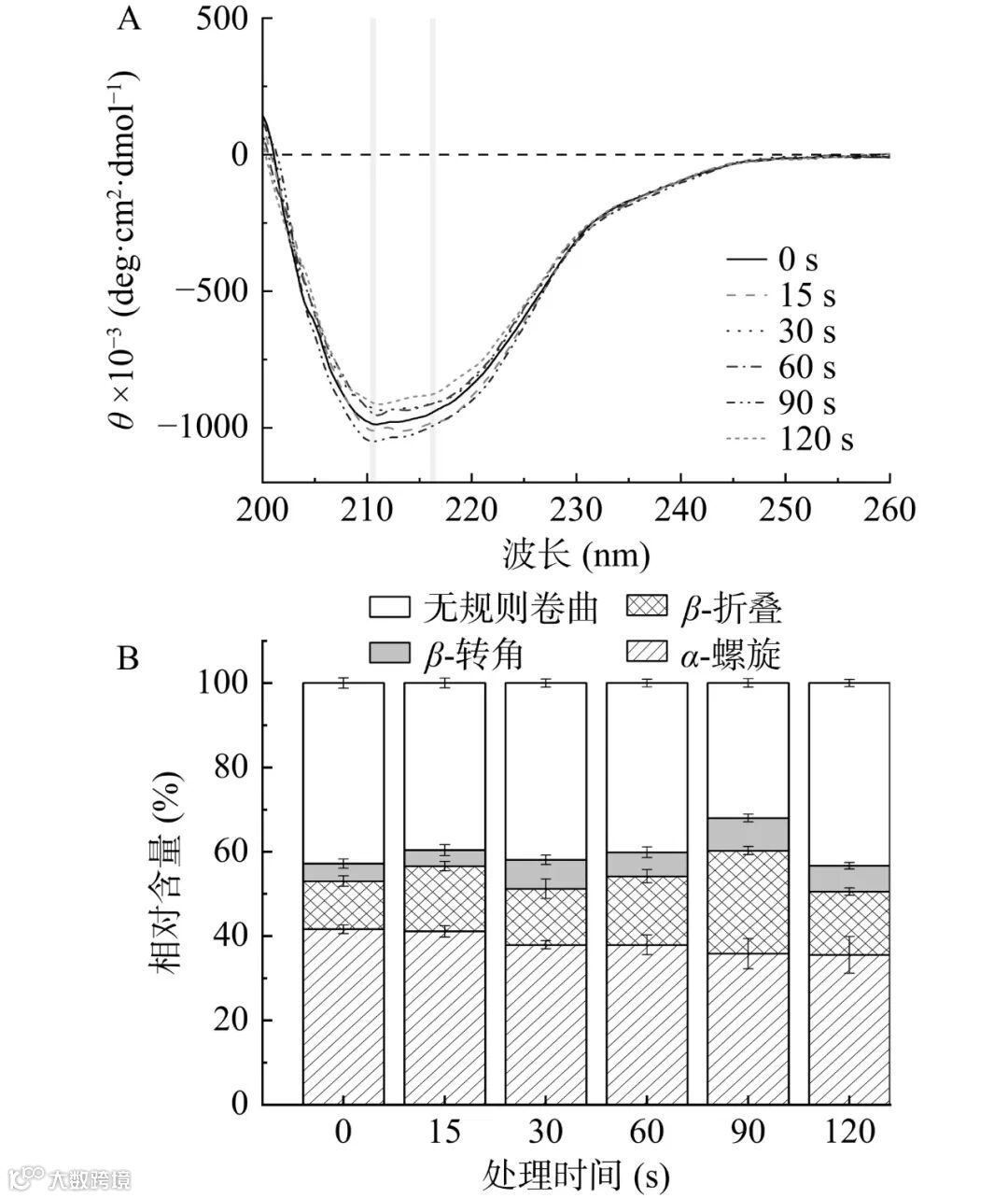 图 5 CP处理前后纤维素酶的圆二色性光谱(A)和二级结构相对含量(B)