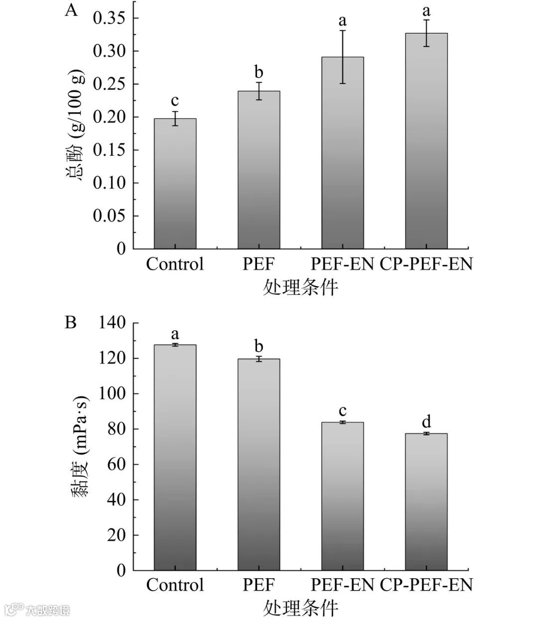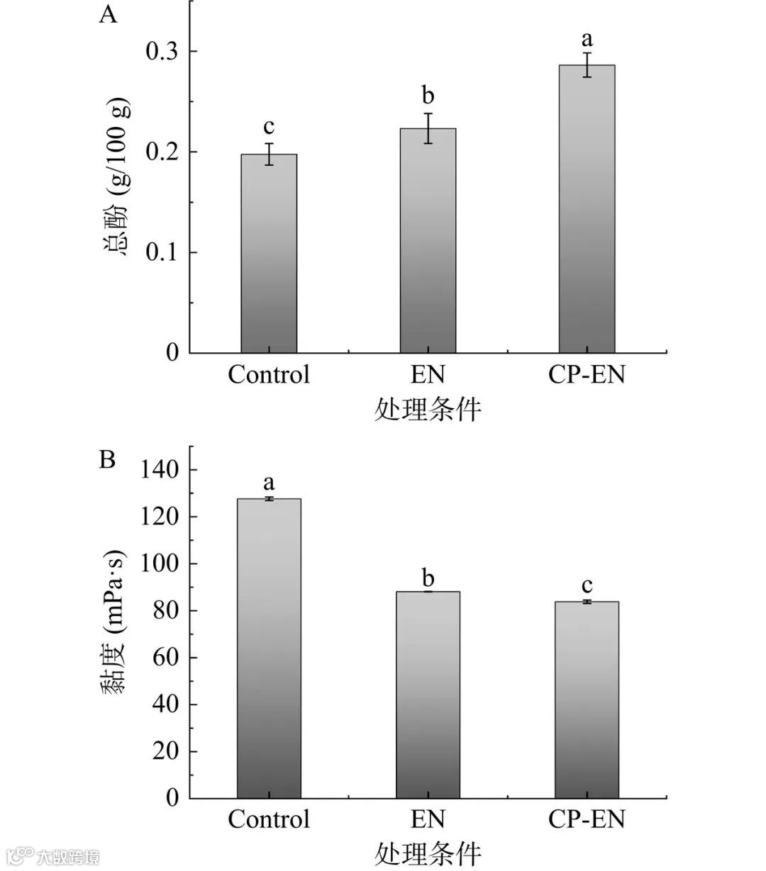 图 6 CP-EN处理对亚麻籽乳的总酚含量(A)和黏度(B)的影响