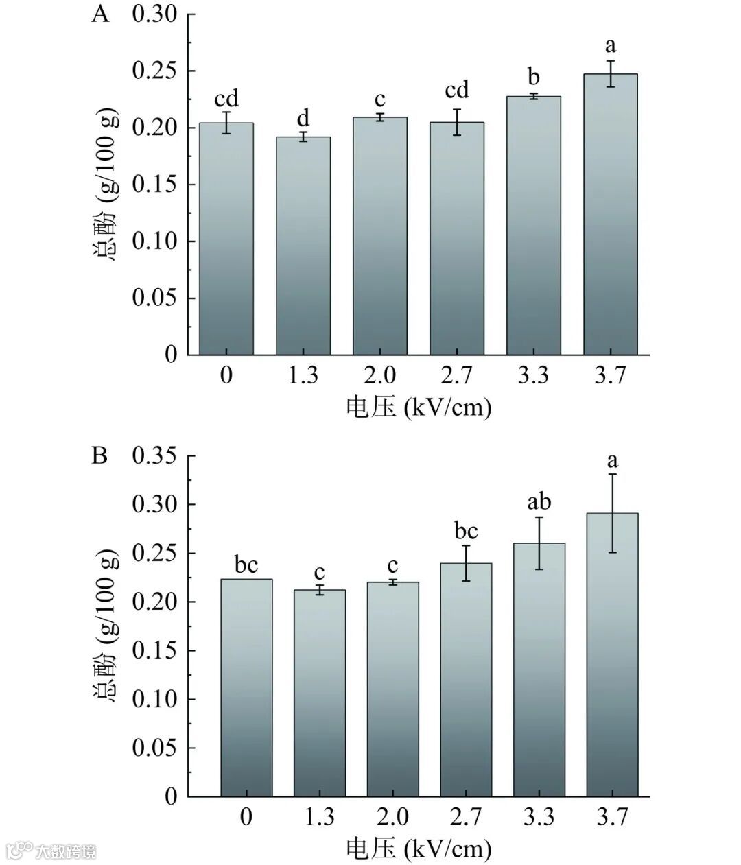 图 7 PEF(A)及PEF-EN(B)处理对亚麻籽乳总酚含量的影响