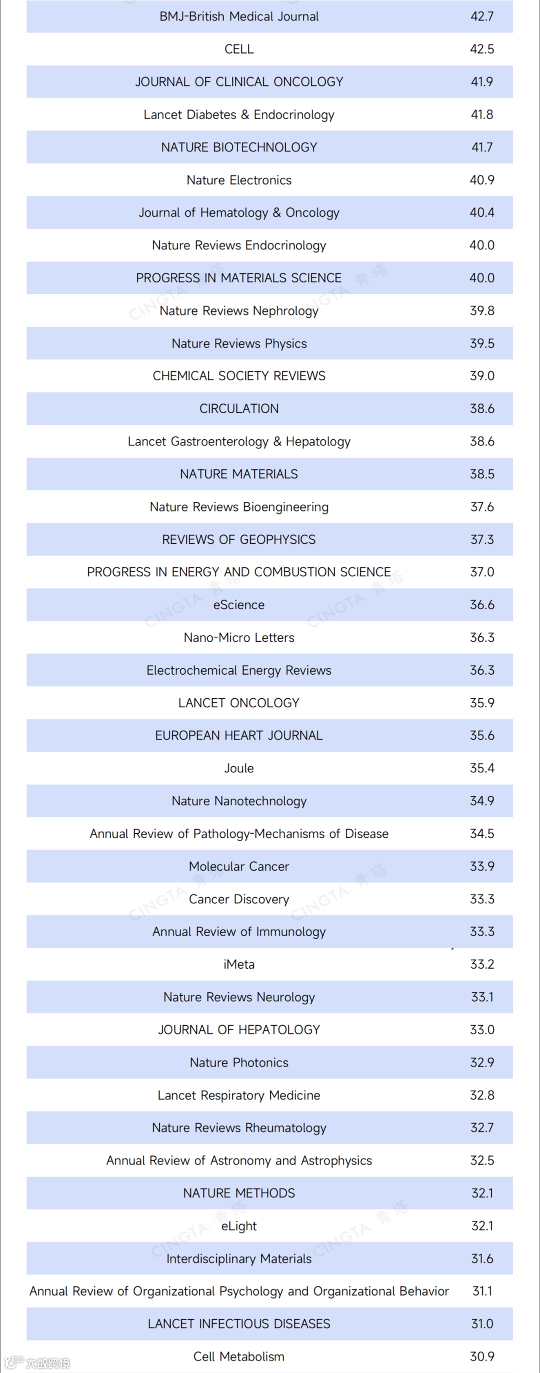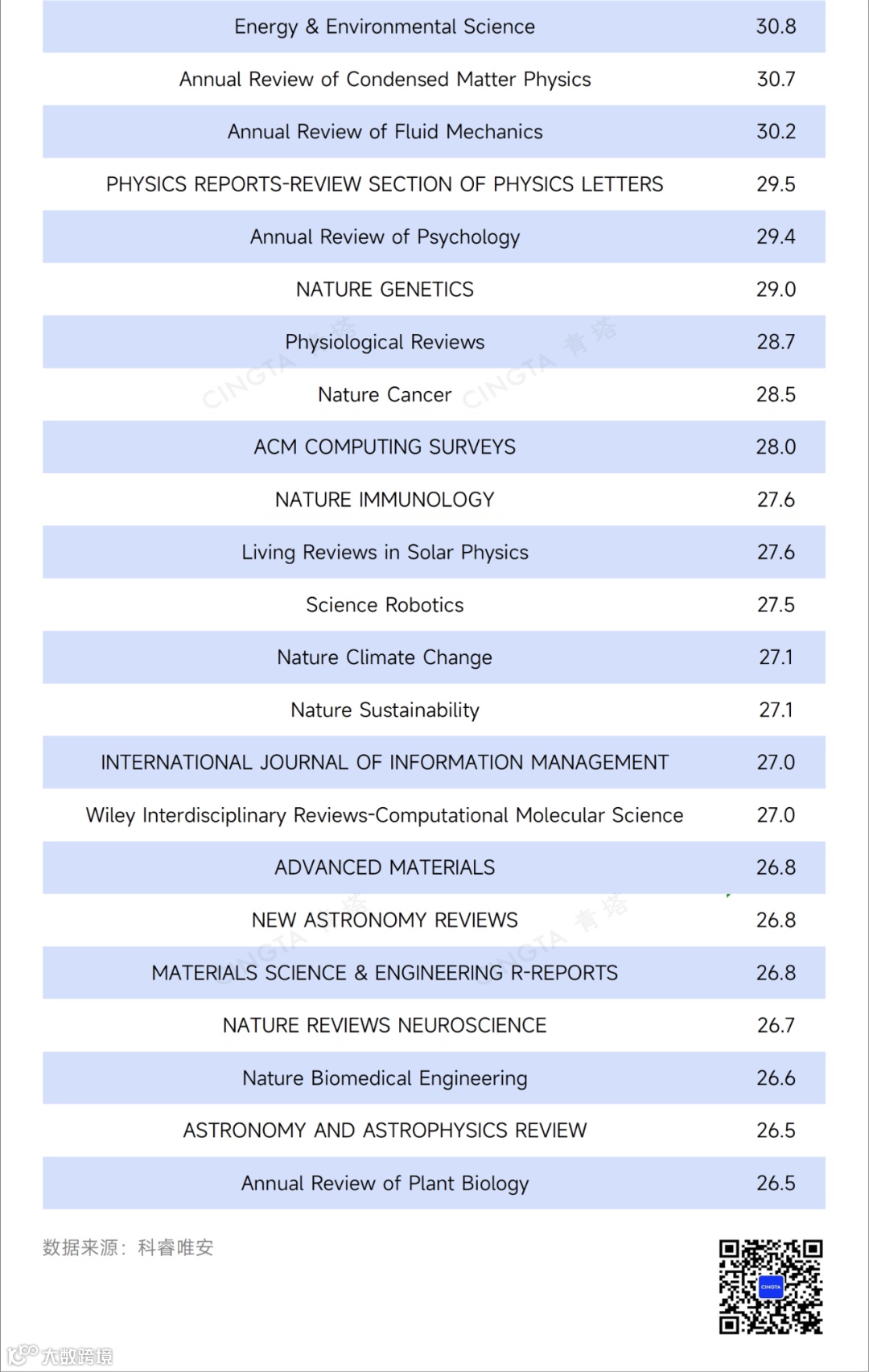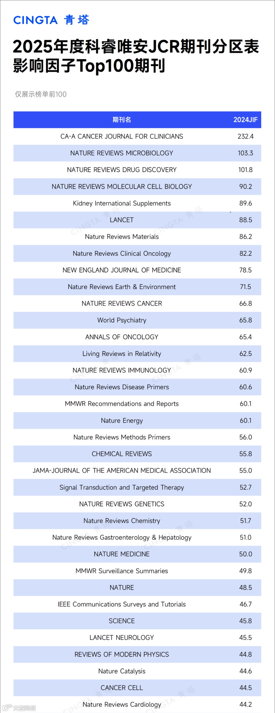 2025年度科睿唯安JCR期刊分区影响因子Top100期刊如下: