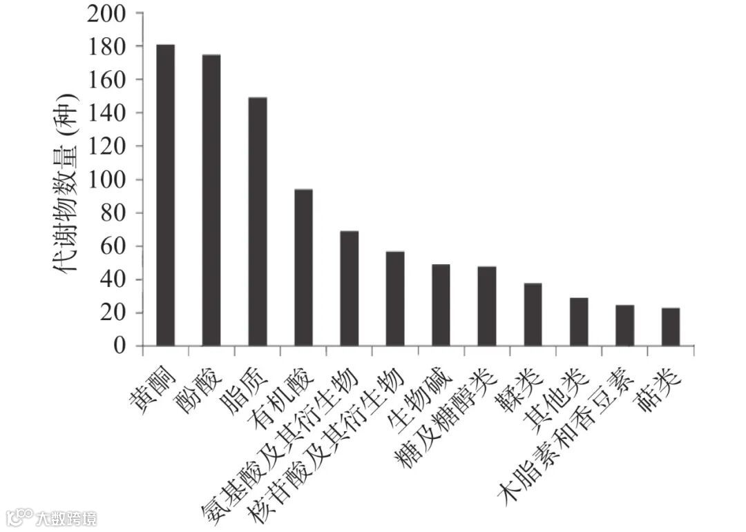 结果在两地红茶中共鉴定出12类937种代谢物,如图2所示,其中包括黄酮类181种(黄酮醇58种、黄酮55种、黄烷醇类21种、黄酮碳糖苷19种等)、酚酸类175种(草酸、绿原酸、松柏醇、松柏醛、紫丁香苷、芥子酰苹果酸、5-O-咖啡酰莽草酸等)、脂质149种(游离脂肪酸66种、甘油酯18种等)、有机酸94种(富马酸、马来酸、奎宁酸、3,5-二羟基-3-甲基戊酸等)、氨基酸及其衍生物69种(L-谷氨酸、L-谷氨酰胺、L-天冬酰胺、L-天冬氨酸、L-精氨酸、L-赖氨酸、L-色氨酸等)、核苷酸及其衍生物57种(烟酸腺嘌呤二核苷酸、L-墨喋呤、胞嘧啶等)、生物碱49种(生物碱27种、酚胺12种等)、糖及糖醇类48种(木糖醇、麦芽糖、松二糖、蔗糖等)、鞣类38种(茶黄素、原花青素B1等)、其他类29种(维生素13种等)、木脂素和香豆素25种(7-羟基香豆素、松脂醇等)、萜类23种(熊果醛、夏罗草酮等)。
