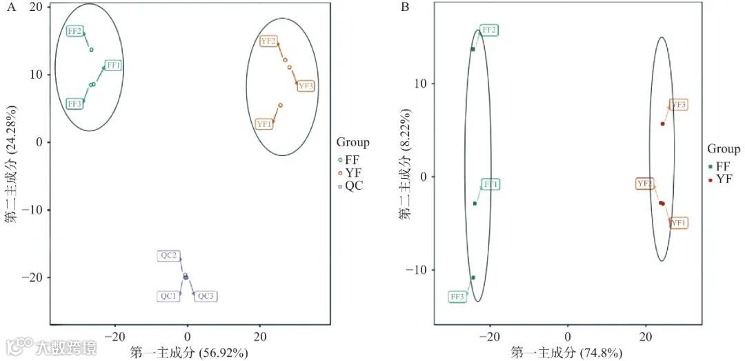 注:A:PCA得分图;B:OPLS-DA得分图。