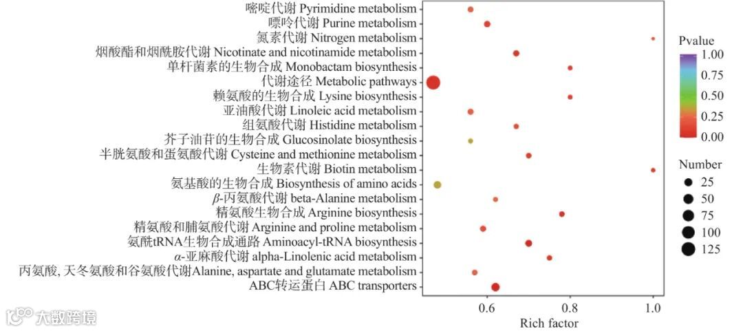 通过KEGG数据库对差异代谢物进行通路富集分析,共有84条通路,在鉴定出来的410种差异显著的代谢物中被KEGG注释到的个数为164个,其中有114个差异代谢物显著上调,50个差异代谢物显著下调,主要分布在20条代谢途径中(图7),其中富集程度最高的(pvalue值越接近0,表示富集越显著)前5条通路分别为:①ABC转运蛋白通路(ABC transporters),主要包括核苷酸及其衍生物、氨基酸及其衍生物、糖类等28种代谢成分;②氨酰tRNA生物合成通路(Aminoacyl-tRNA biosynthesis),主要包括核苷酸及其衍生物、氨基酸及其衍生物等14种代谢成分;③精氨酸生物合成通路(Arginine biosynthesis),主要包括氨基酸及其衍生物、有机酸等7种代谢成分;④代谢途径(Metabolic pathways),主要包括核苷酸及其衍生物、氨基酸及其衍生物、糖类、有机酸、生物碱、酚酸类、黄酮、维生素等127种代谢成分;⑤烟酸酯和烟酰胺代谢(Nicotinate and nicotinamide metabolism),主要包括核苷酸及其衍生物、有机酸、维生素等10种代谢成分。
