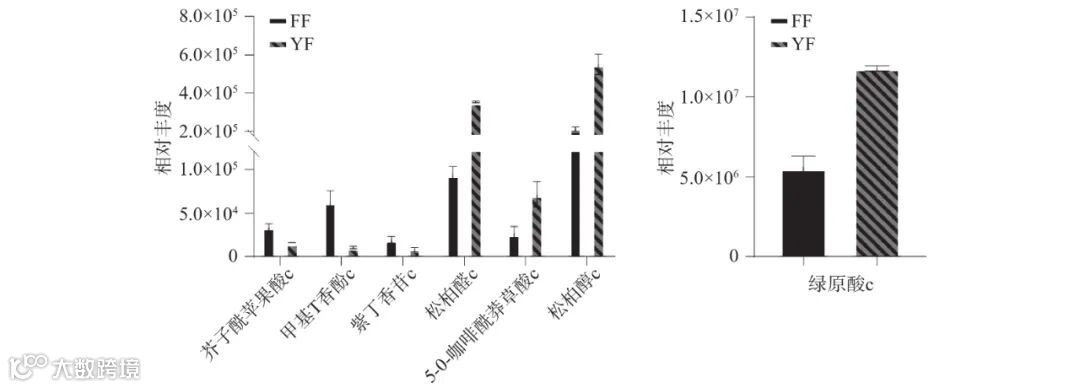 如图10所示,在苯丙烷生物合成通路中,尤溪红茶有4种酚酸物质显著上调,其中绿原酸的含量较高,上调了2.1倍,它在茶汤中呈苦涩味,并随着浓度的增加而增强,福安红茶有3种酚酸物质显著上调。