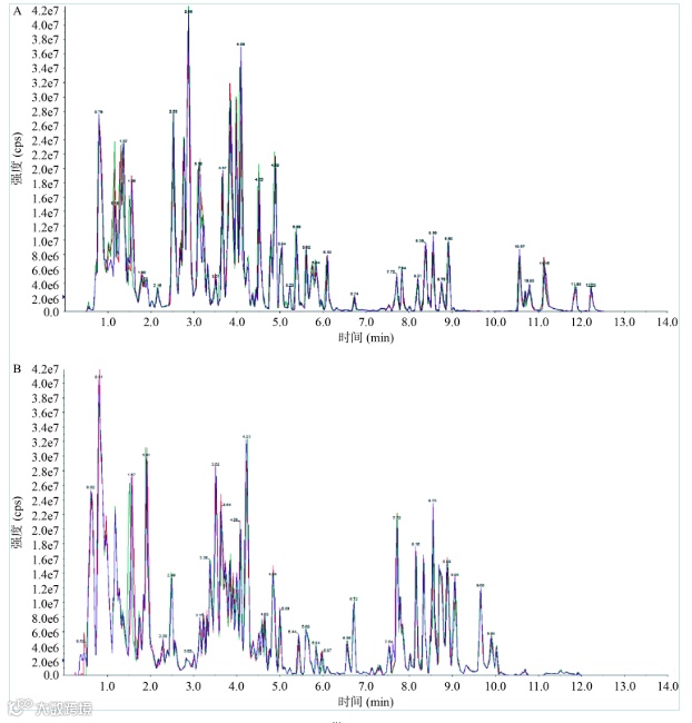 注:A:负离子模式;B:正离子模式。