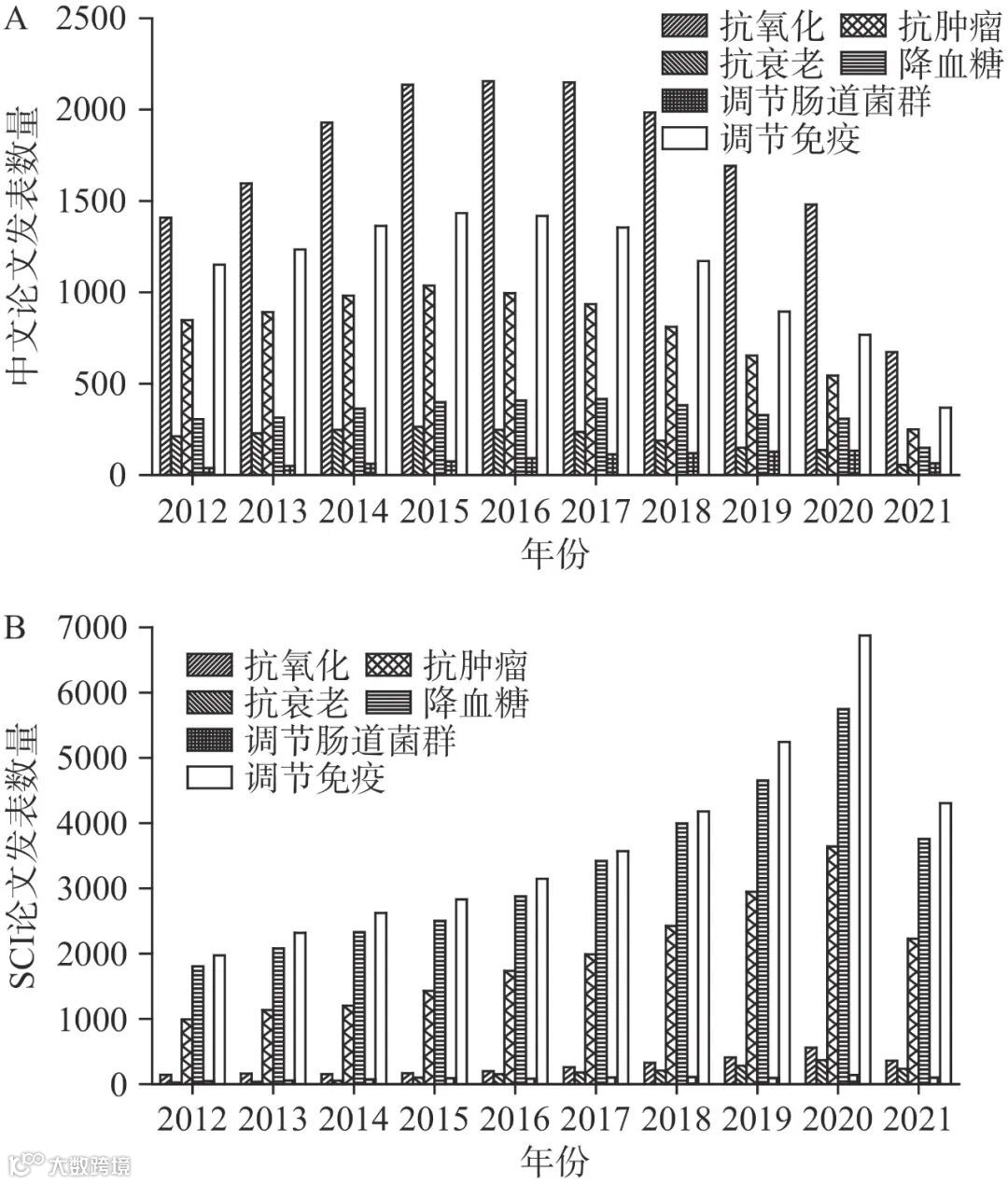 近十年关于植物多糖活性研究较多,主要集中在抗氧化、抗衰老、抗肿瘤、降血糖、调节肠道菌群和调节免疫六个方面,不同来源的植物多糖的具体生物活性如图3所示。在此基础上,本文统计万方和Science Direct两个数据库从2012~2021年期间多糖活性的国内外科学论文发表数量,统计结果如图4所示。由图4可获得以下三点信息:a.关于多糖抗氧化和抗衰老方面的科学论文发表数量,国内多于国外。但国外针对多糖活性研究报道主要聚焦于抗肿瘤、降血糖和调节免疫三个方面,而国内研究较少;b.国内外关于多糖调节肠道菌群的研究报道均较少;c.随年份增加多糖生物活性的研究报道呈现上升趋势,科学论文发表数量逐年增长。