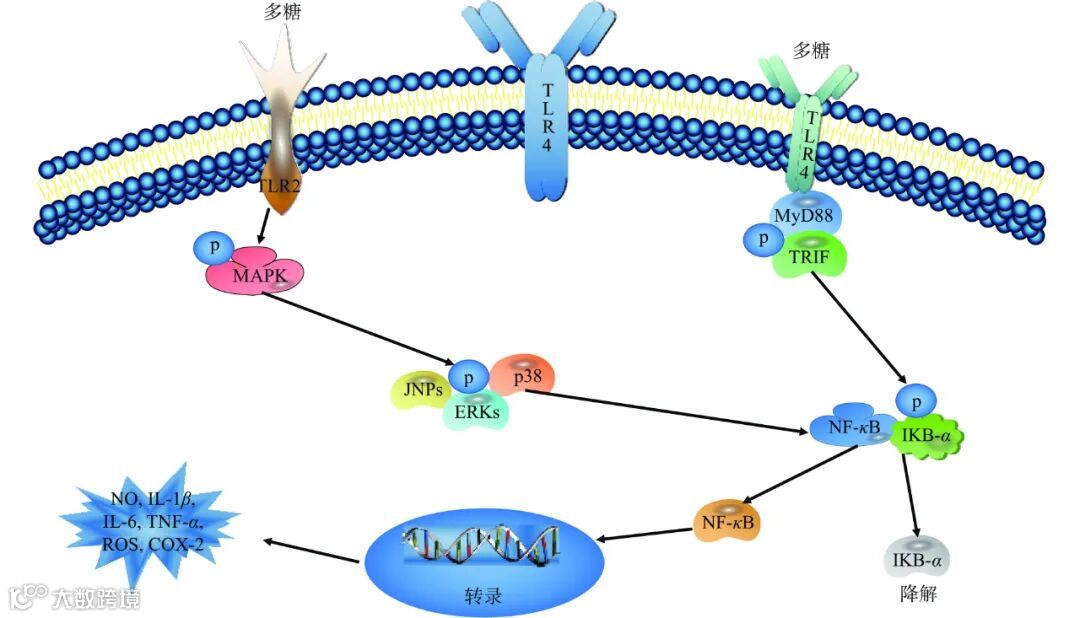 多糖免疫调节作用具有多途径、多环节、多靶点的特点。多糖在调节免疫方面发挥了重要作用,具体作用机制如图6所示。吴磊等研究白莲莲子皮多糖调节免疫的活性,发现其通过刺激巨噬细胞释放NO和细胞因子(TNF-α、IL-6、IL-1β)来增强免疫调节活性。郝敏等经研究发现黑木耳胞外多糖具有促进肠道内有益菌群增殖,增加短链脂肪酸含量及上调血清抗炎因子水平的作用。谌淑平等探究五种食用菌多糖复配物的免疫调节活性,发现不同食用菌多糖的复配物均可调节巨噬细胞RAW264.7的免疫活性。Wang等研究脐带苔藓多糖对小鼠巨噬细胞RAW264.7的免疫作用,发现其可明显促进巨噬细胞的增殖和吞噬活性。Fan等研究黄芪、白术和芝麻三种多糖在体外对鸡巨噬细胞的免疫调节活性,发现白术多糖与芝麻多糖相比,芝麻多糖对鸡巨噬细胞的免疫作用更强。综上分析发现多糖主要通过增强巨噬细胞的增殖和吞噬活性来发挥其免疫调节活性。