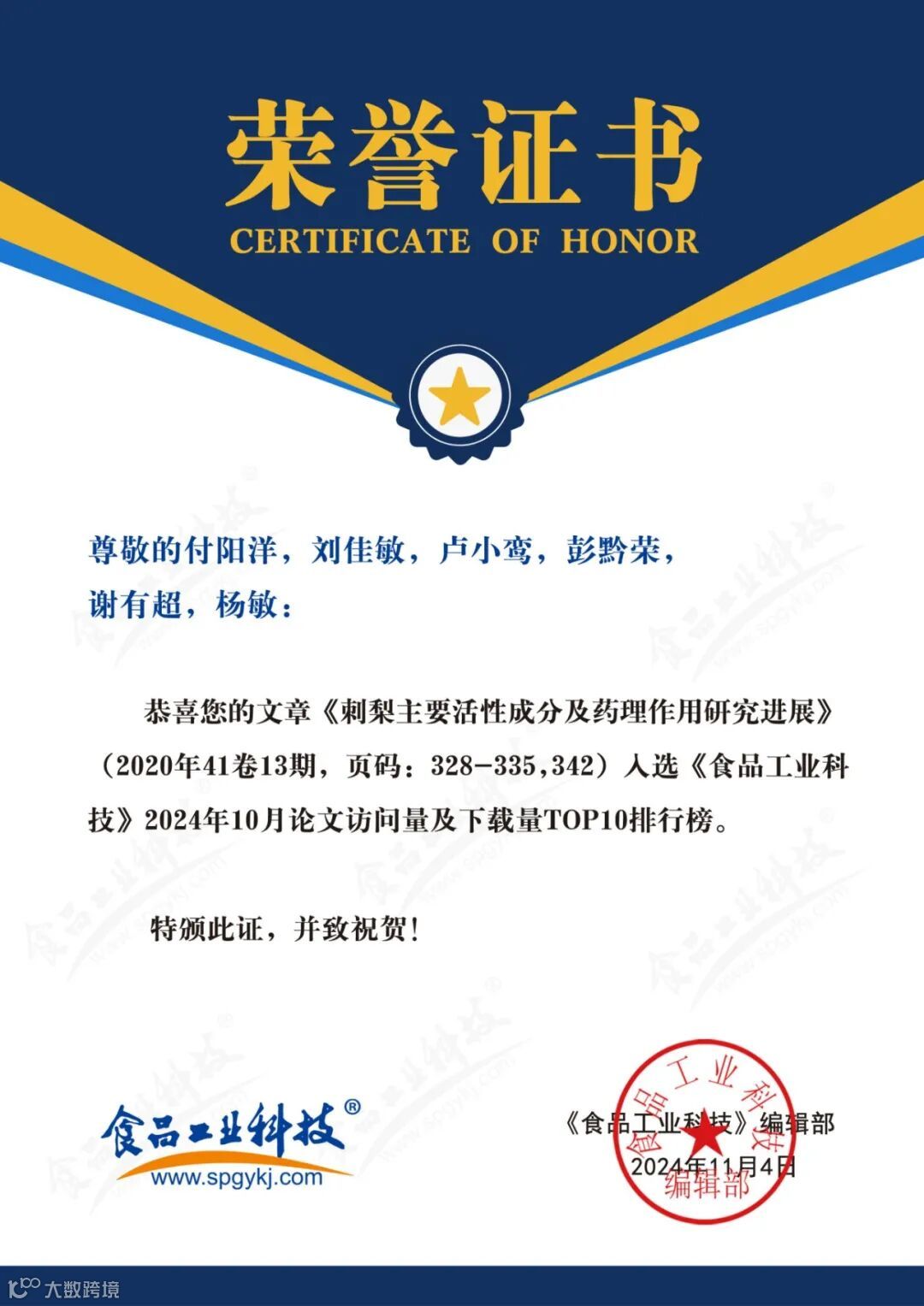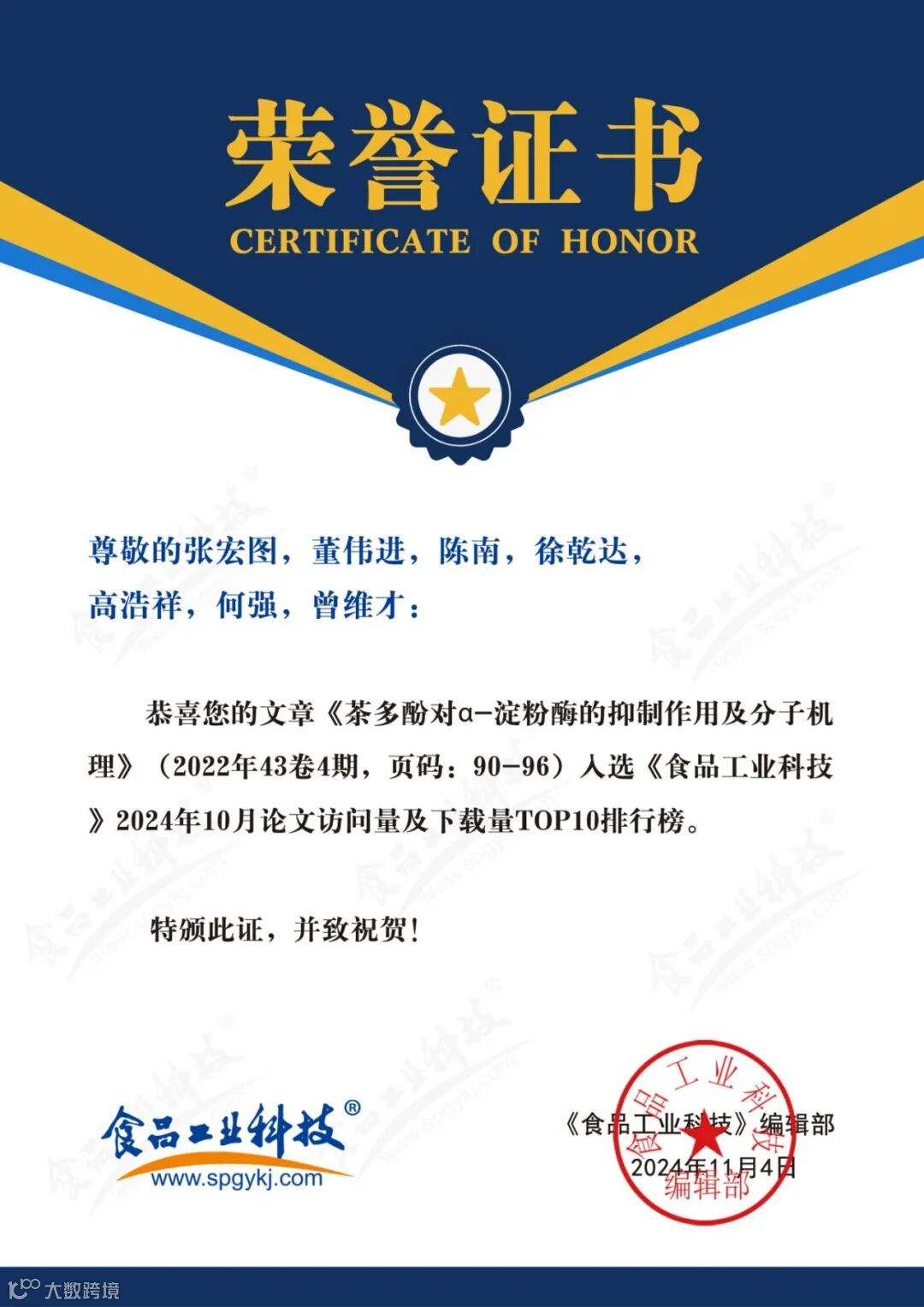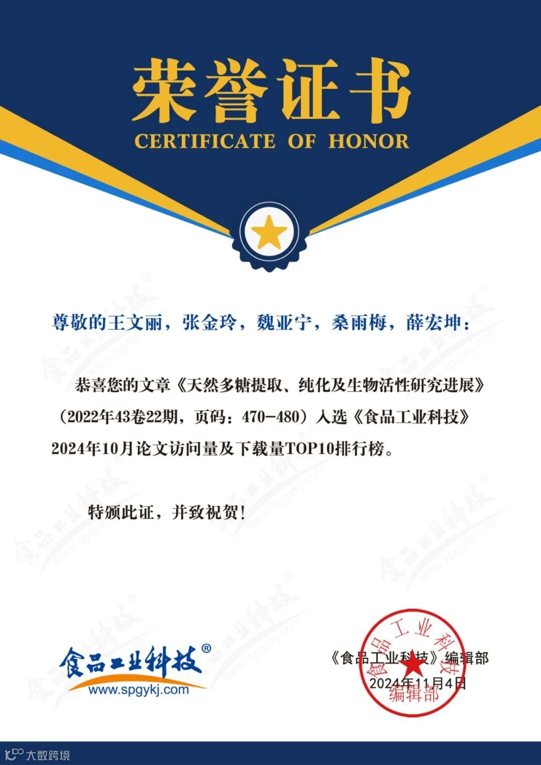 2024年6月起,《食品工业科技》编辑部每月将会公布上个月的文章下载量排行榜。《食品工业科技》将坚守办刊宗旨,秉承严谨细致、精益求精的工作态度,肩负时代赋予的社会责任,稳中求进、奋楫争先,为推动我国食品领域的发展做出更多贡献。