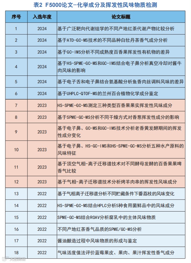在2022-2024期间,化学成分及挥发性风味物质检测类文章数量每年均为6,从篇数来看近三年的热度平稳。其中,83%的文章采用了GC、GC-MS、GC-IMS、UHPLC等多种先进的检测方法,这些方法凭借其高精度、高灵敏度以及良好的分离效果,在化学成分及挥发性风味物质的检测研究中占据着主导地位;而有22%的文章采用了电子鼻的检测方法,这种新兴的检测技术以其独特的优势为该领域的研究带来了新的思路和方法。