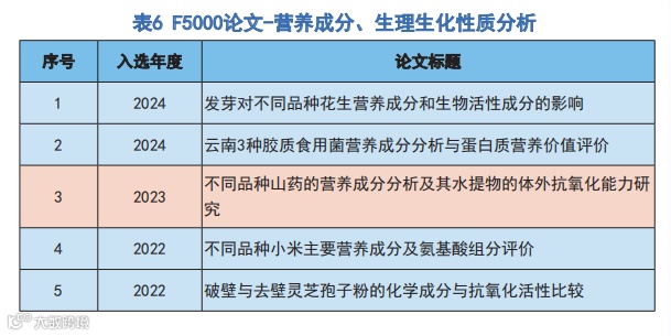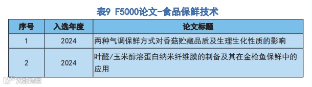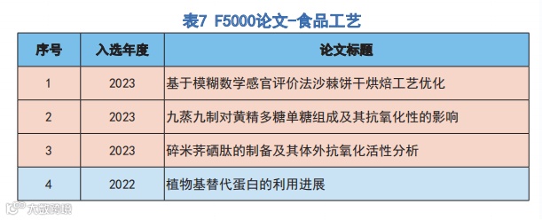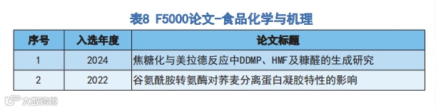 随着食品学科日新月异的发展,食品工艺类的文章在当前的学术投稿环境里,呈现出了颇为严峻的低投稿率以及低录用率的状态。在过去的较长一段时间里,有关食品工艺类的文章投稿数量呈现出明显的下滑趋势,并且即便有相关文章投稿,其能够被选中的概率也较低。这种情况愈发严重,甚至有些专业期刊明确不再录用有关食品工艺类的文章,这无疑是给该领域的学术研究和成果传播带来了一定的阻碍。从表7清晰地可以看出,2024年食品工艺类的F5000稿件篇数降为0,这一现象充分凸显出了食品学科的研究方向正在发生着显著的变化,越来越多的研究可能更倾向于食品科学的创新应用、食品与健康的关联等前沿热点方向。