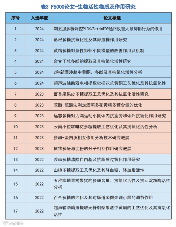 值得注意的是,17篇文章中沙棘和黄精受到了较高的关注——有关沙棘的研究为2篇,有关黄精的文章也有2篇。具有生物活性物质的食材很多,而明显沙棘和黄精的热度更强。