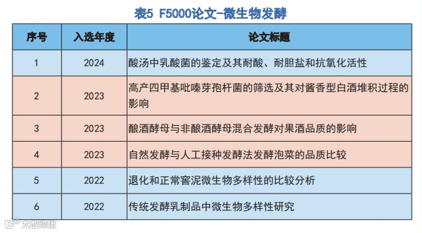 从2022-2024年入选F5000的数量来看,微生物发酵方向的文章篇数不稳定,没有呈现出明显且稳定的增长或下降的趋势。然而,值得注意的是,在入选F5000的微生物发酵方向的文章中,有50%的文章其研究的对象为酒类,这一数据占比反映出酒类在微生物发酵研究领域中占据着相当重要的位置。