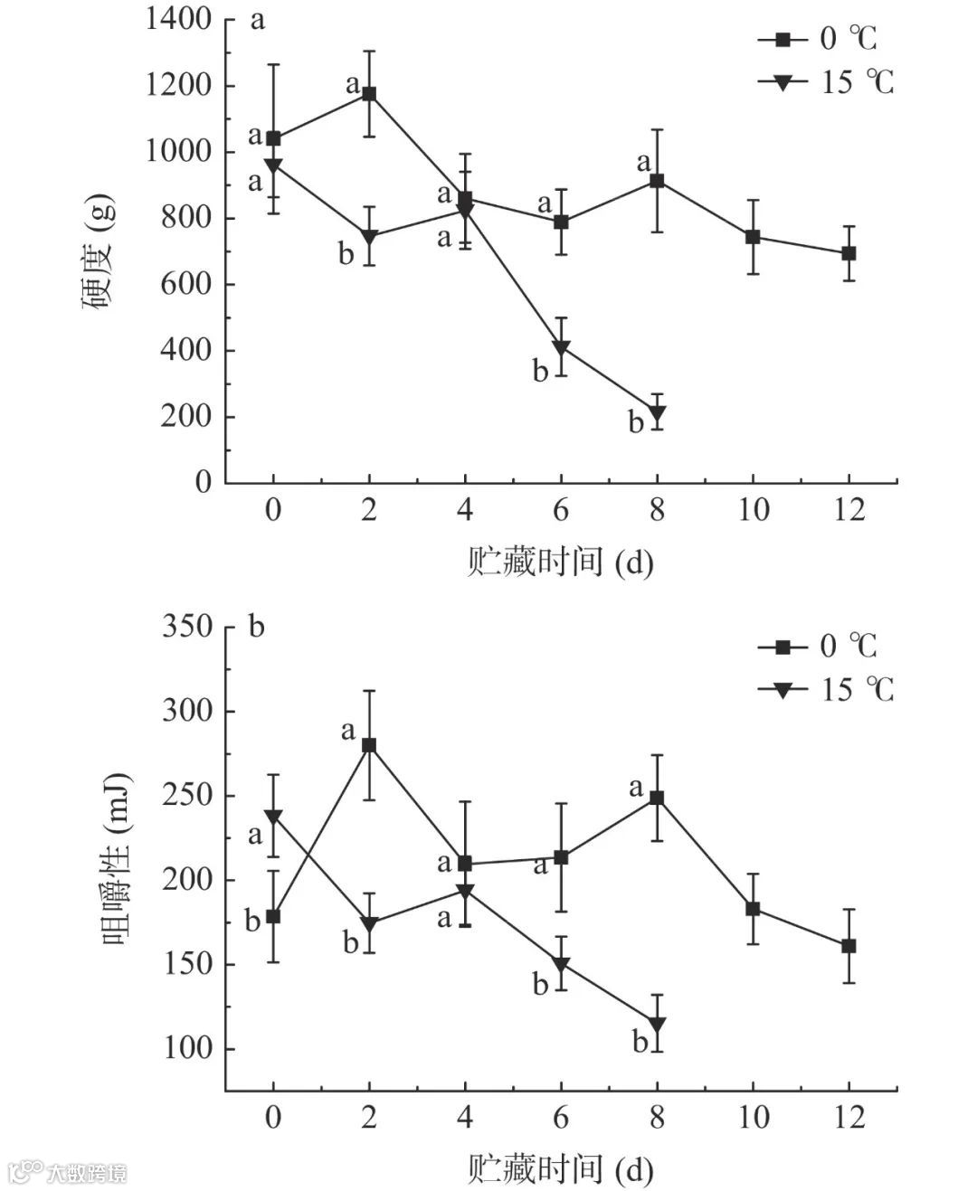 图 3 不同贮藏温度对大球盖菇硬度(a)和咀嚼性(b)的影响
