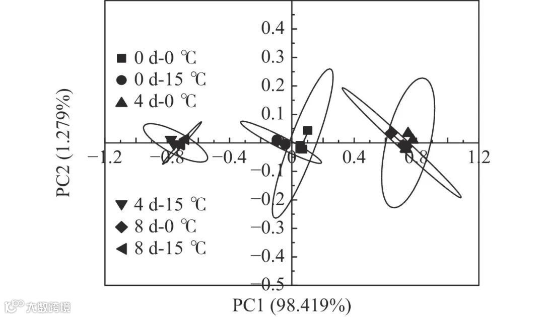 注:因第12 d时只对0 ℃贮藏组进行了电子鼻检测,无法进行准确的PCA分析,故12 d时PCA数据缺失。