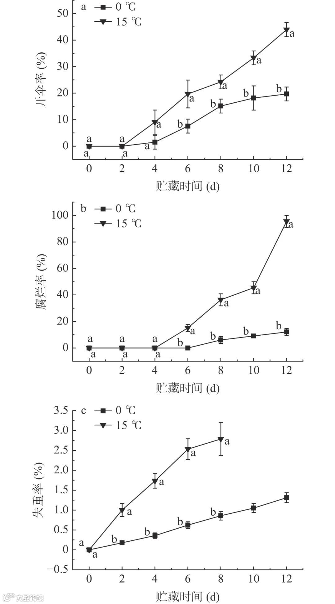 华中农业大学食品科学技术学院、果蔬加工与品质调控湖北省重点实验室的饶克诚,黄文,王益,刘莹等人研究不同贮藏温度(0 ℃和15 ℃)对大球盖菇品质和挥发性风味成分的影响,旨在通过比较开伞率、腐烂率等指标,为大球盖菇的贮藏保鲜提供理论依据。