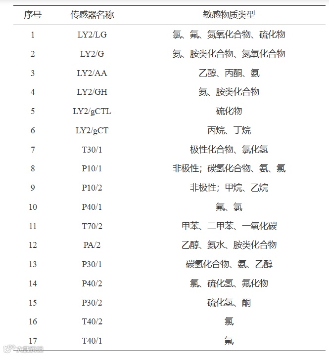 Table 1 Sensitive substance type of each electronic nose sensor