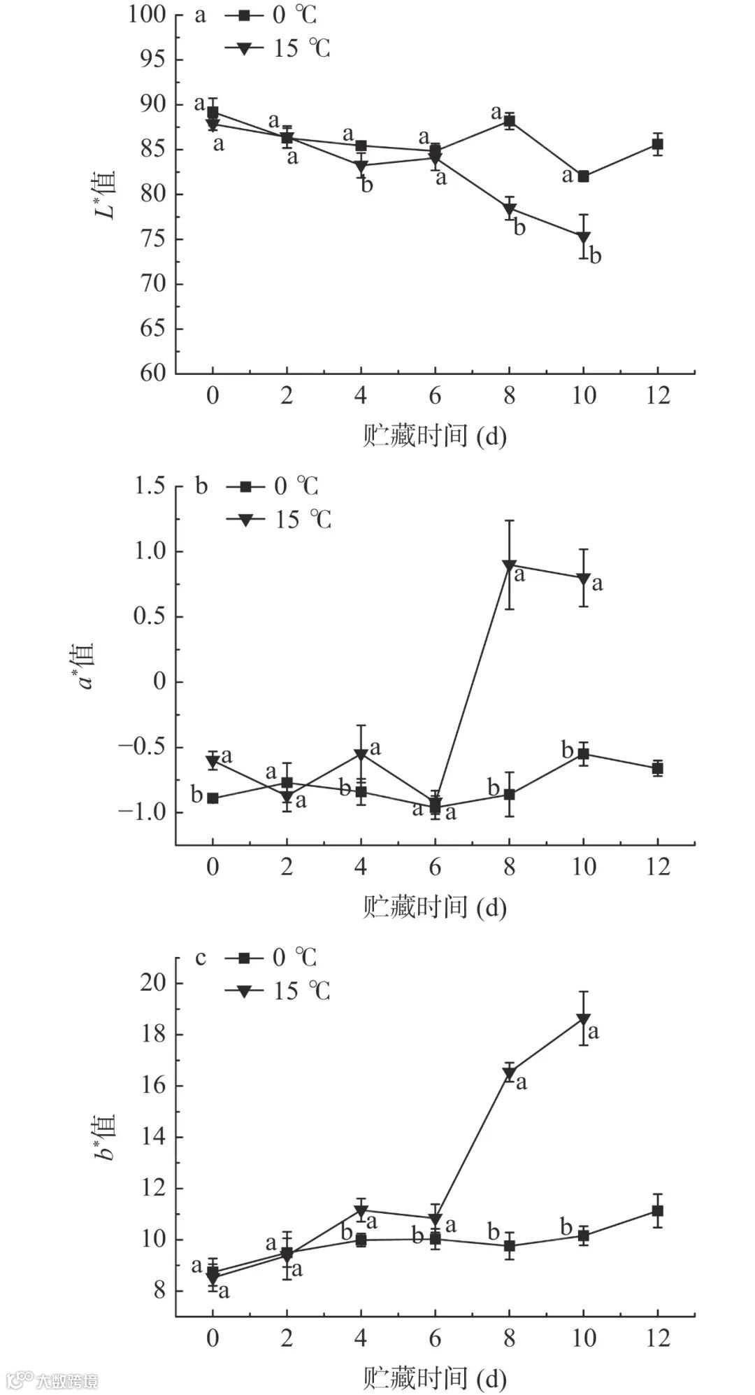 注:因大球盖菇样品腐烂,15 ℃贮藏组第12 d无法进行色泽测定;不同字母代表相同贮藏时间不同样品之间具有显著性差异(P<0.05),图2、图3同。