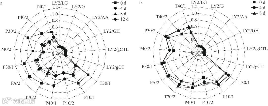 图 5 0 ℃(a)和 15 ℃(b)贮藏下大球盖菇的电子鼻雷达指纹图