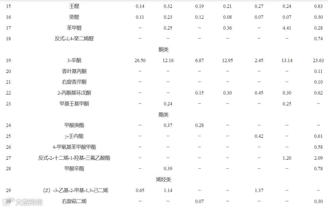 表 2 不同贮藏温度下大球盖菇挥发性物质变化