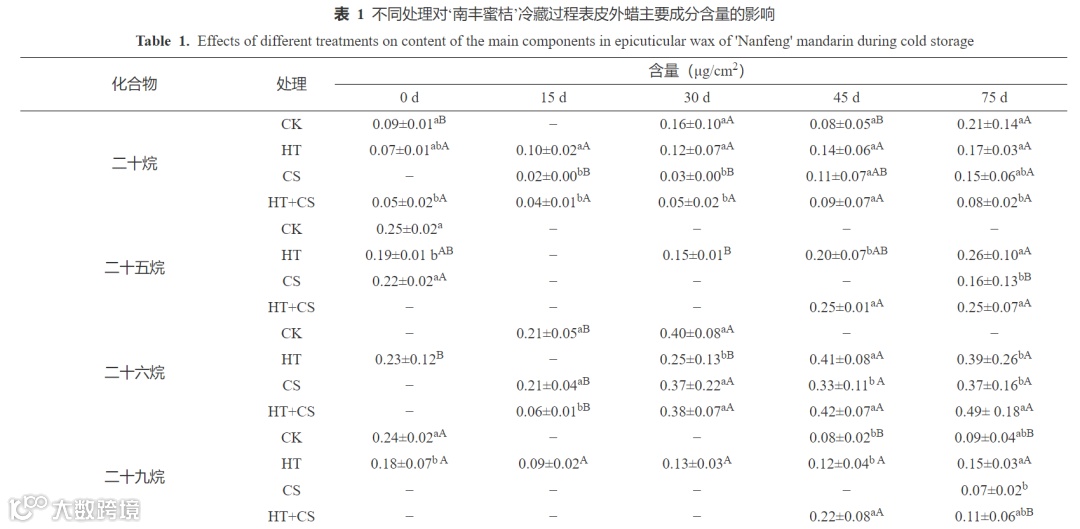Figure 2. Effects of different treatments on the content of epicuticular wax components of 'Nanfeng' mandarins during cold storage