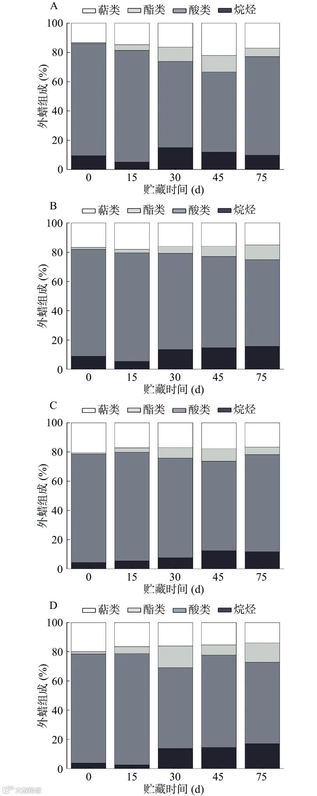 图4展示了检出的表皮内蜡总量的变化,所有处理的内蜡总量整体趋势为先减后增。在冷藏15~75 d,各处理之间的含量变化差异明显。这期间HT组和HT+CS组保持较高的含量,而CK组和CS组在冷藏过程中都保持着先减后增的变化趋势。冷藏45 d时3种保鲜方式均能有效抑制外蜡和内蜡含量的降低,其中热激效果最为明显。整个冷藏阶段含量最高的是第75 d的CK组,达到5.46 μg/cm2,最低为第30 d的CS组为1.91 μg/cm2。4类主要成分的含量和比例变化与外蜡相比有所不同。酸类同样是表皮内蜡中含量最高的成分(图4)。在酸类的变化中,第15 d HT组含量最高为3.44 μg/cm2,是同期CK组的1.88倍;HT+CS在冷藏结束时达到了3.27 μg/cm2,是同期CK组的1.60倍。Belge等采用热激和CO2冲击处理成熟的桃果实,在0 ℃下贮藏2周后在20 ℃下贮藏5 d,发现热激组的蜡质含量和百分比都为最高。与图3不同的是,酸类比例不再占据领先优势,烷烃和萜类占比明显提高。分析图4中烷烃含量的变化,发现冷藏过程中除30~45 d的HT+CS组和第75 d的CK和CS组外,其他时间点的处理组之间差异不显著,表明表皮内蜡对蜜桔果实保水无作用。与外蜡萜类相反的是内蜡萜类含量随贮藏时间延长而逐渐升高,尤其到了冷藏第75 d,CS组和CK组含量达到最高的1.35和1.23 μg/cm2,分别是冷藏前的2.08倍和2.17倍,可能是冷藏后期为了合成更多的萜类成分以抵御微生物的侵染。针对表皮内蜡各组分的比例变化(图5),观察发现CK组、HT组及CS组3个处理组中的萜类比例存在相同的变化趋势,均为先增后减,而HT+CS组在酯类和萜类中占比分别为持续下降和持续上升。所有处理的酸类比例在冷藏中的趋势一致,为“上升-下降-上升”,所有处理的烷烃比例在冷藏前期也均存在先减后增的现象,表明贮藏期间果实角质层的成分代谢处于动态变化之中。